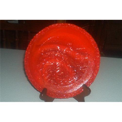 This is a beautiful "FENTON" signed decorative plate which has embossed figures of Washington and LaFayette standing and appear to be in deep discussion. (The pictures cannot show the beautiful detailed figures of Washington and LaFayette completely). I tried very hard to get good pictures, but the bright red plate was hard to get a good photo. Also, the bottom edge of the plate is embossed with the following: In Recognition Of The Friendship Of THE MARQUIS DeLAFAYETTE. On the bottom of the plate is the following: The Bicentenial Anniversary Of The Nation He Helped Bring Into Being: THE UNITED STATES OF AMERICA. At Valley Forge In 1777, The Young Volunteer, Lafayette, And His New Commander, George Washington, Began A Friendship That Was To Last The Rest Of Their Lives. This decorative, bright red, plate measures 8 inches in diameter. It is MARKED FENTON. As you can see by the pictures, there are lovely swirls in the pattern also. This Fenton decorative plate is in mintCondition. Includes Wooden Stand.