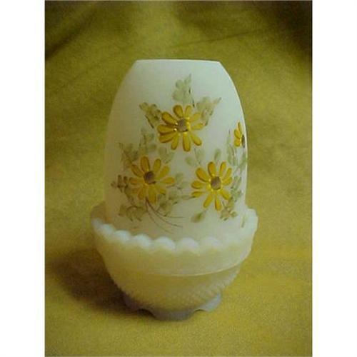 This custard glass Fenton Art Fairy Light has the original Fenton paper sticker. The custard satin is decorated with yellow flowers and green leaves. The "Instructions for Burning" label is on the inside of the base. The piece is signed by Vicki Felder who hand painted it.