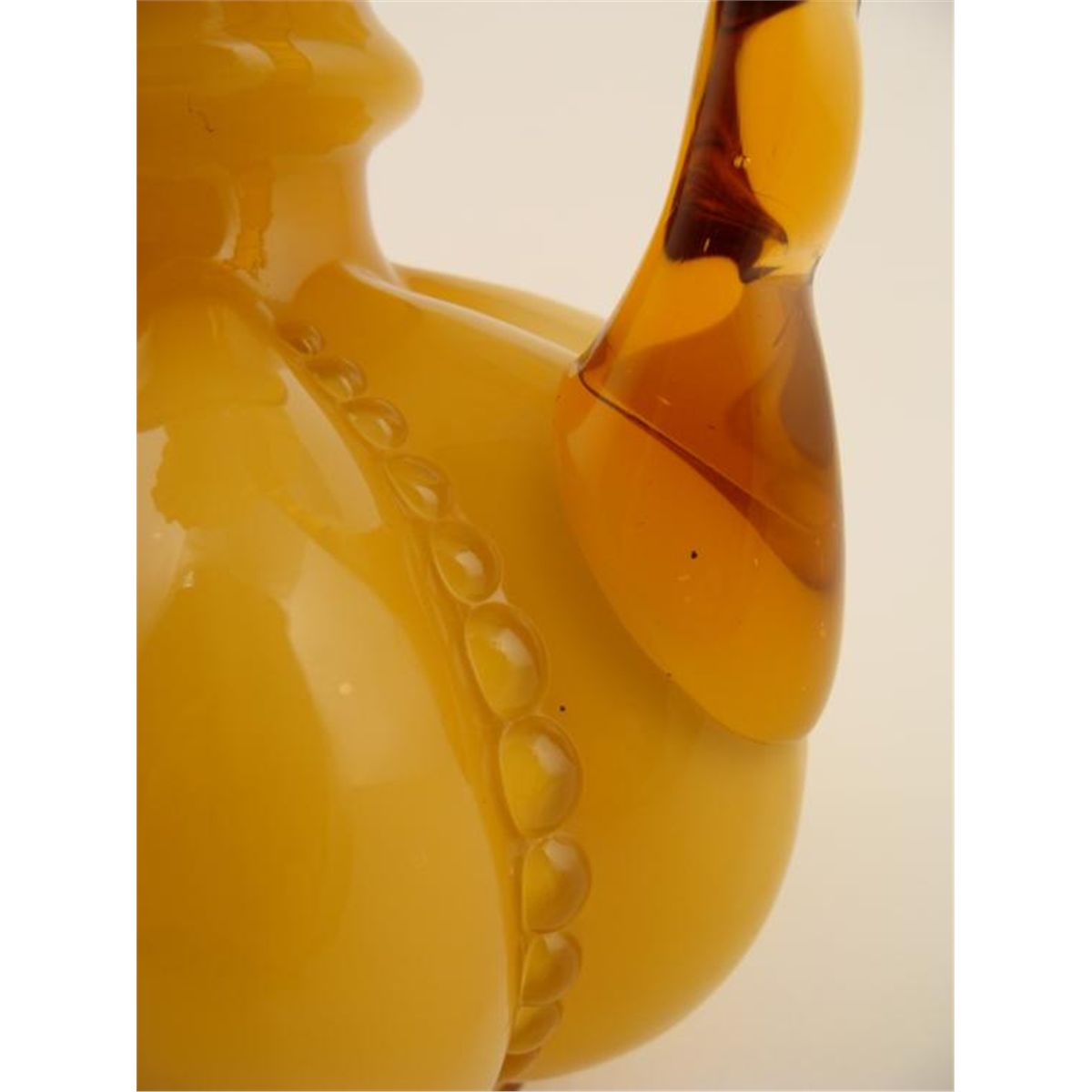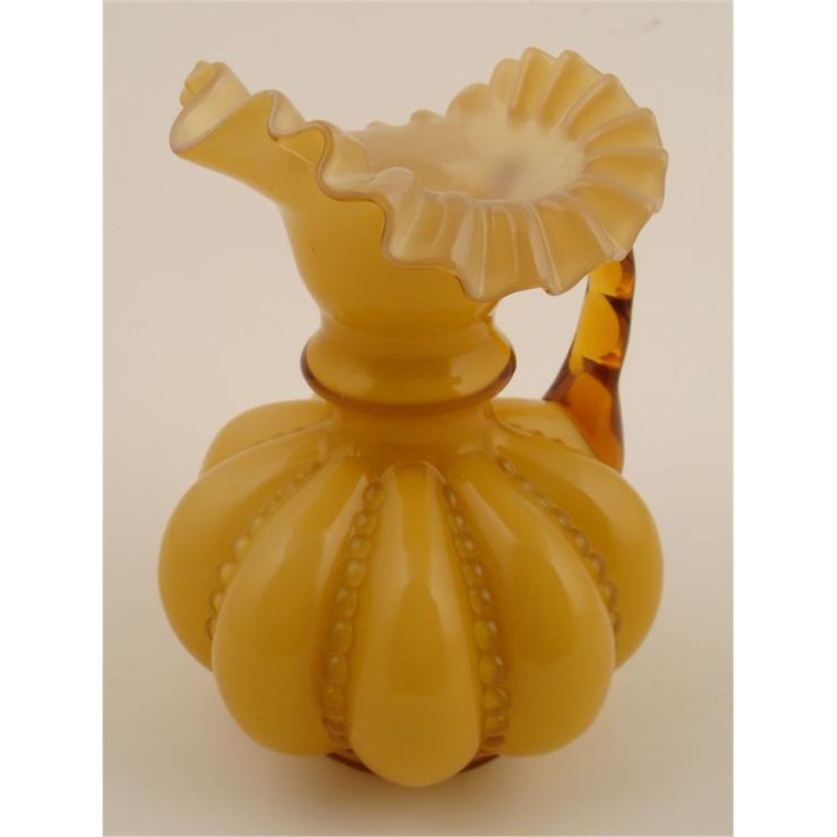 Here is a rare Fenton glass Beaded Melon Ambercrest Pitcher. It features a crimped rim, and white interior. The dimensions are 8" tall and 5 3/4" in diameter. The condition is excellent. * This rare amber pitcher will make a great find for any collector.