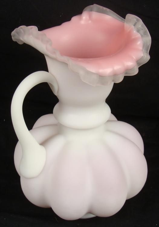 This pitcher from Fenton is called a peach crest or melon crest, and it has a more pale exterior, and a ruffled and crimped rim. * Condition: ExcellentSize: 9" tall, 6" in diameter