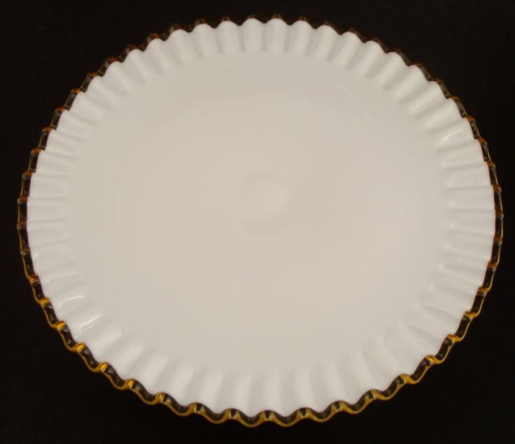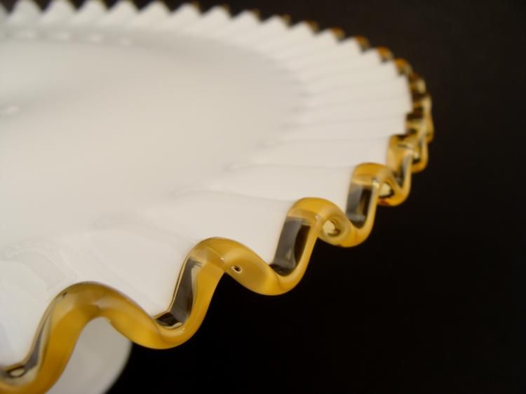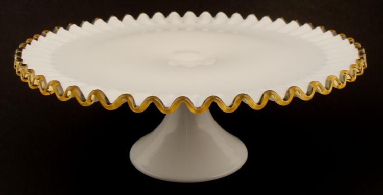 Here is a rare vintage Fenton Gold or Amber Crest cake stand. It is traditional milk glass with crimped rim, and pedestal stand. The dimensions are 5 1/4" tall and 13 1/2" in diameter. The condition is excellent, with no chips or cracks. * This is one of the most sought after of the crested cake stands.