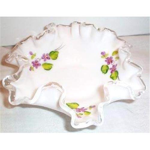 This fantastic Hand Painted Fenton Ruffled Bon-Bon is decorated with lovely blooming violets and is in SUPERIOR condition with no chips, cracks, or dings. The vase measures 6" in diameter and stands 2" tall. This is marked on the bottom with the Fenton logo in an oval.