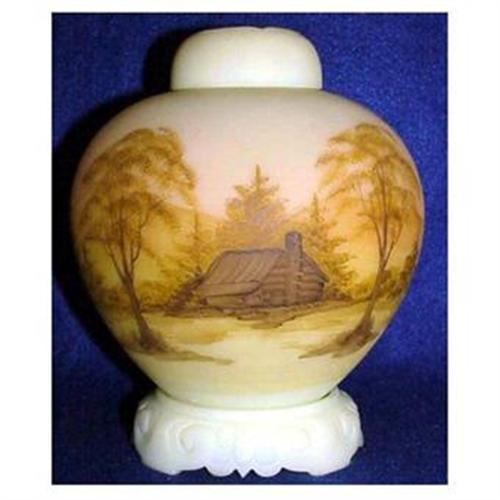 This Fenton three piece ginger jar is Fenton # 7288. This is the most popular of Fenton's scenic decorations. This item was made circa 1978. There are no cracks, no chips, and no repairs to any of the three pieces. This item is in excellent condition.