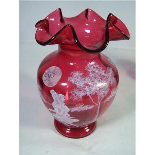 Fenton Mary Gregory cranberry Vase with girl and Wheelbarrow with Flowers 7" Caskins Signed