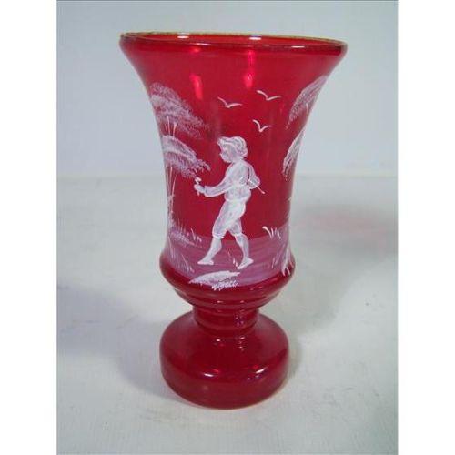 Fenton Mary Gregory cranberry Italian urn with boy 4 1/2"