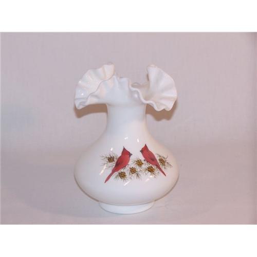 This is a rare Hand Painted Cardinal Ruffled Vase- by Jim Andrick- it has a double stamped logo on the bottom- with 2 different Fenton Marks- this is an unusually rare find- both for its Hand Painted picture of an almost christmas type scene with deep red cardinals and pine cones- the bottom of the vase has 2 different imprinted logos-