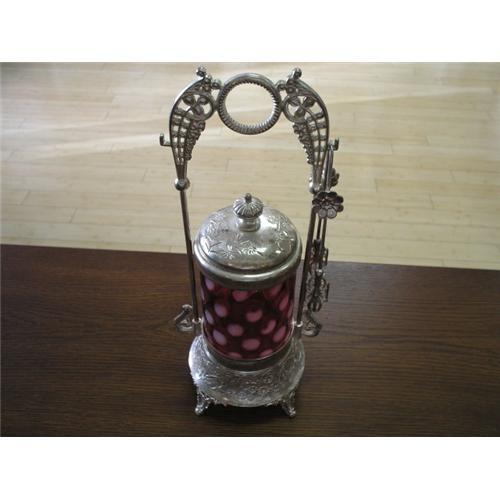 Fenton Pickle Caster made of silverplate with tongues attached and a Ruby Red Coin pattern insert.