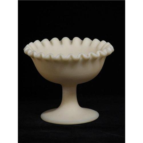 Fenton Satin Custard Compote, ruffled edge, Unsigned, 4 H x 5 3/4 D. Condition: no damage noted.