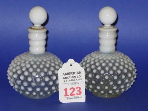 Pair of old hobnail Fenton scent bottles w/ stoppers. 7"t. 2 lbs (5-123)