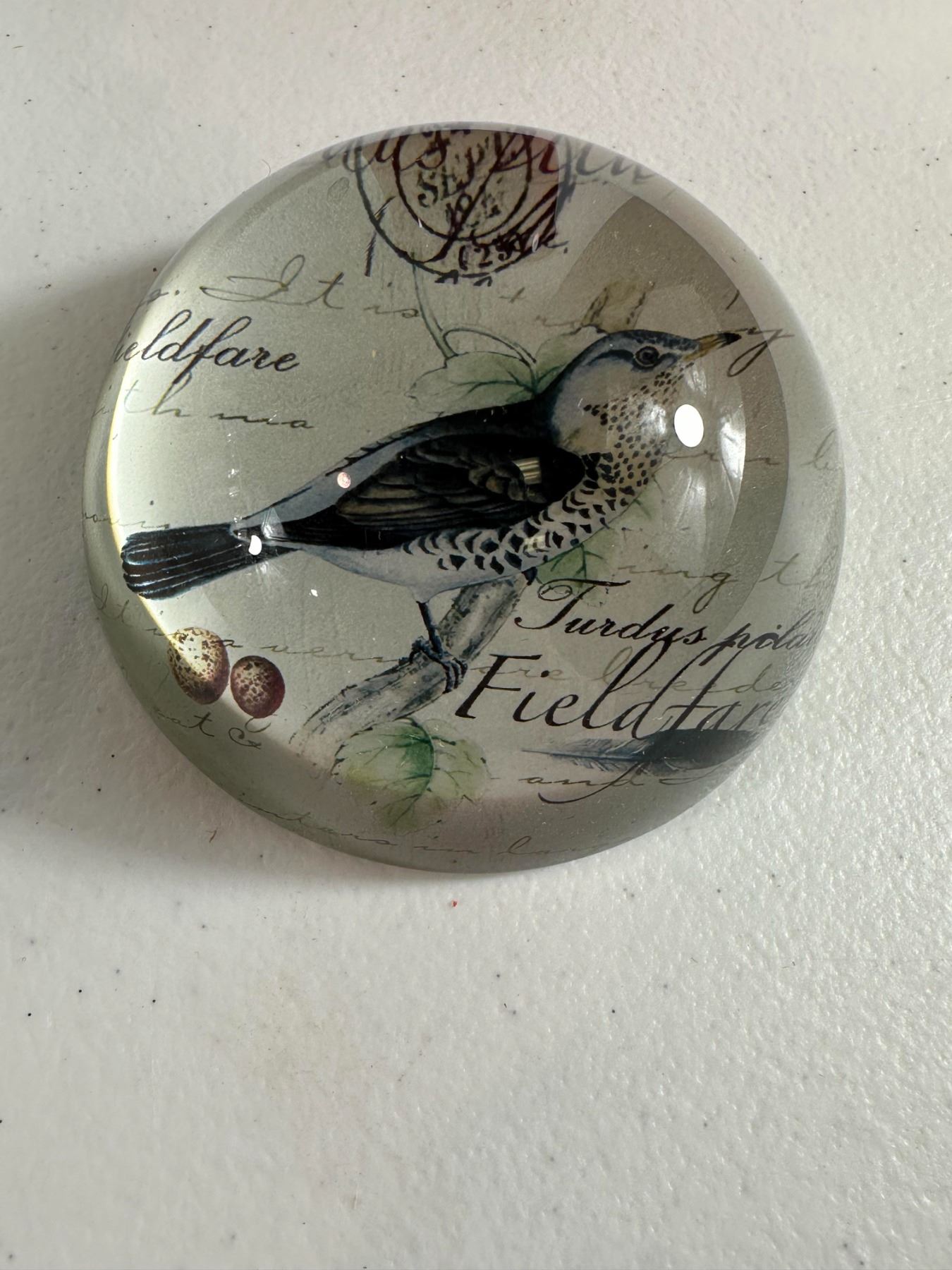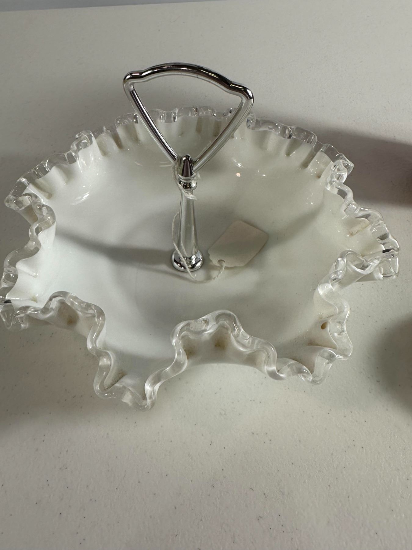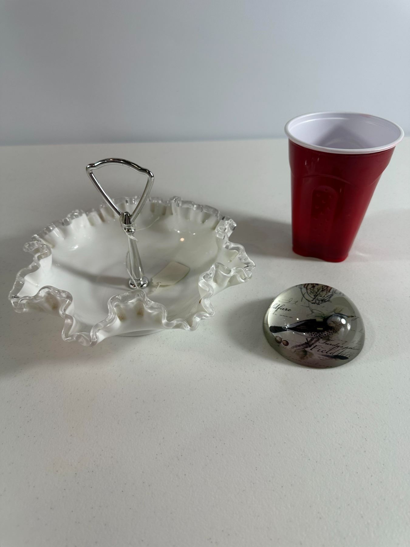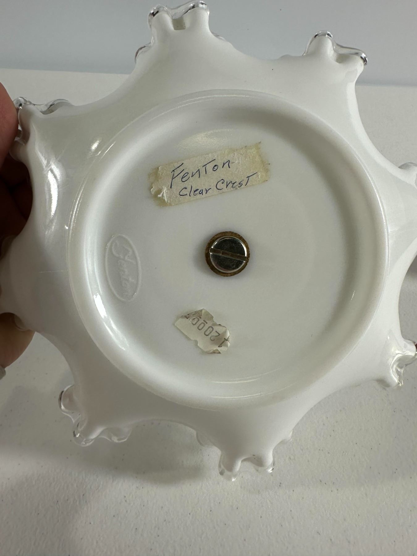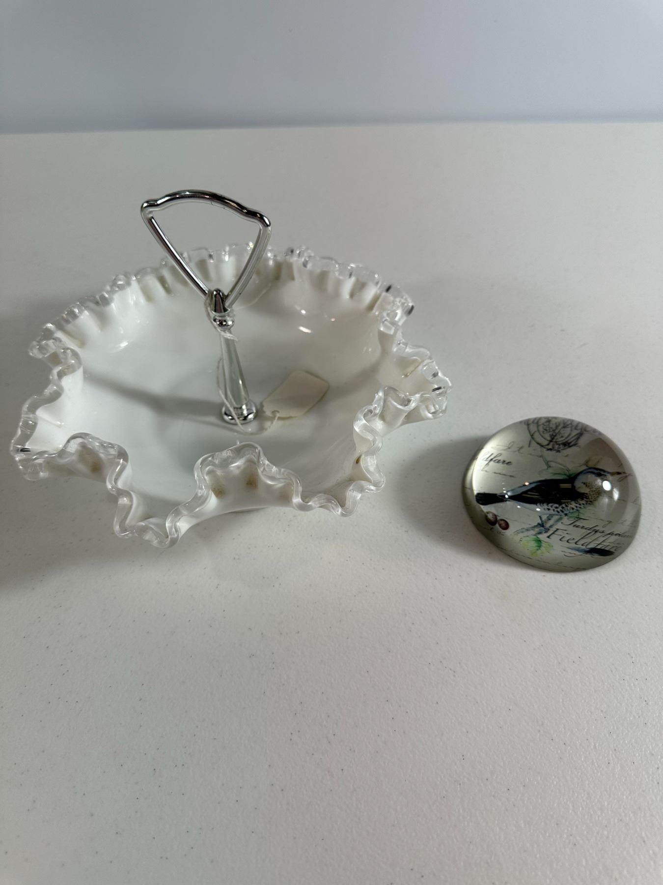 White milk glass ruffled bonbon with clear crimped edge (Fenton Silvercrest) and a clear dome bird motif paperweight. Elegant vanity or serving accents; minimal wear.