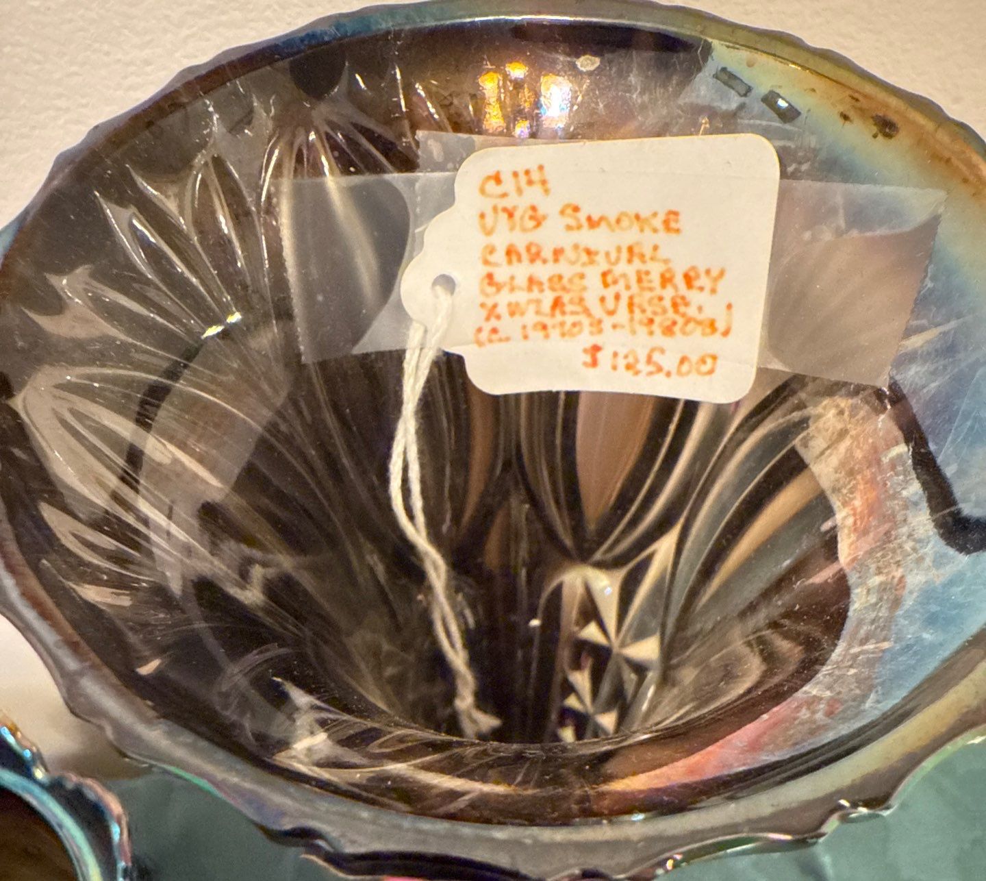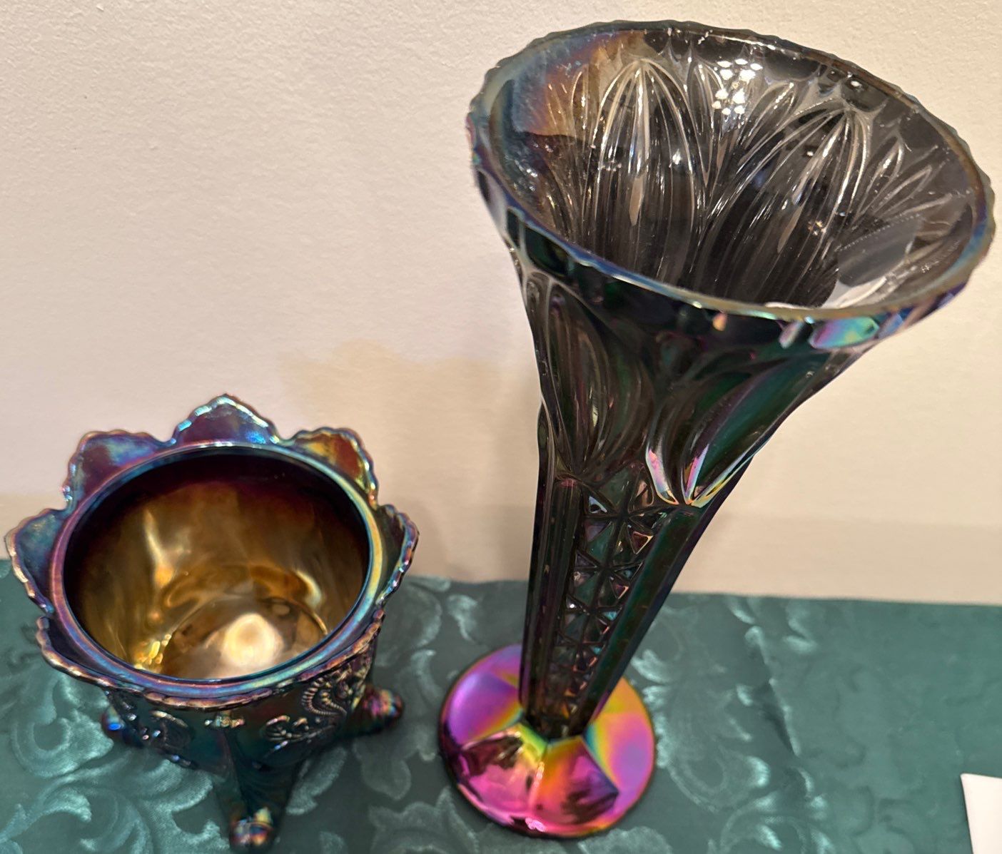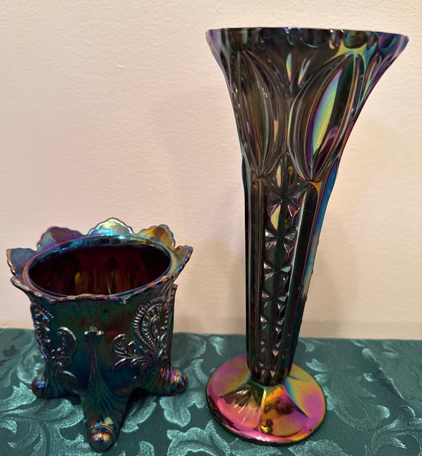 Fenton Smoke Carnival Glass Vase & Footed Trumpet Vase w/Ruffled Rim