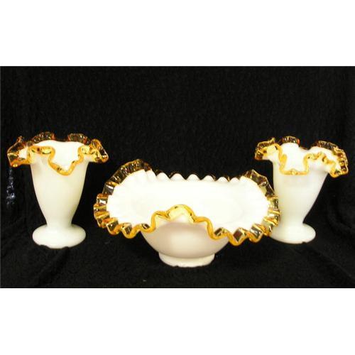 Lovely vases with a 4" well ;bowl with 2.5"well; is white with a applied gold glass edge - is ruffled and fluted - no chips or cracks and made by the famous Fenton Glass Co of Ohio in the 1930s