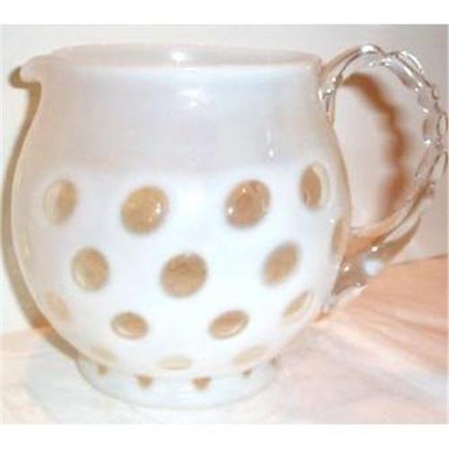This fantastic Fenton White Opalescent Coin Dot Milk Jug is in SUPERIOR condition with no chips, cracks, or dings. The milk jug or pitcher measures 5.50" spout to handle and stands about 8" tall.