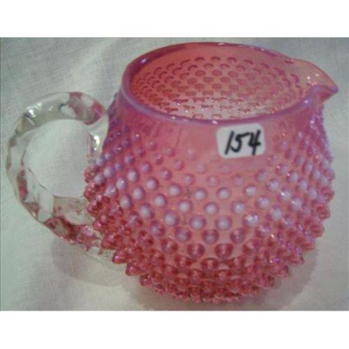 Fenton cranberry opalescent hobnail juice size pitcher with clear crimped handle - very old