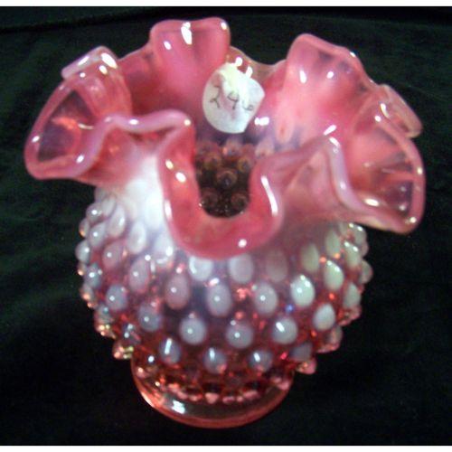 Fenton cranberry opalescent vase 5" hobnail ruffled and crimped