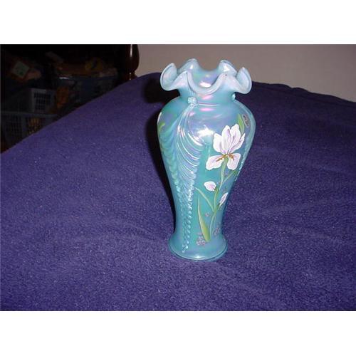 <table width="100%" border="0" cellspacing="0" cellpadding="4"><tr><td><em> THIS IS TRULY A LOVELY VASE!! GEORGEOUS!!</em></td></tr><tr> <td width="100%"> This gorgeous turquoise vase stands 11 inches tall and made to hold a large bouquet of your favorite flowers. Irises are hand painted on the sides, and the bottom of the vase is signed by the artist. The top of the vase is made up of large scallops. It is truly a masterpiece! Made by Fenton in Williamstown, WV. </td></tr><tr> <td> </td></tr><tr> <td>Reference #: RD150</td></tr><tr><td>Condition:Excellent</td></tr><tr><td>Year:1990s</td></tr><tr><td>Country:USA</td></tr><tr><td>Height:11.0</td></tr><tr><td>Title:Fenton hand-painted and signed turquoise vase</td></tr><tr><td>Materials:glass</td></tr><tr><td>Location:Franklin County (Greater Columbus), Ohio, U.S</td></tr></table>