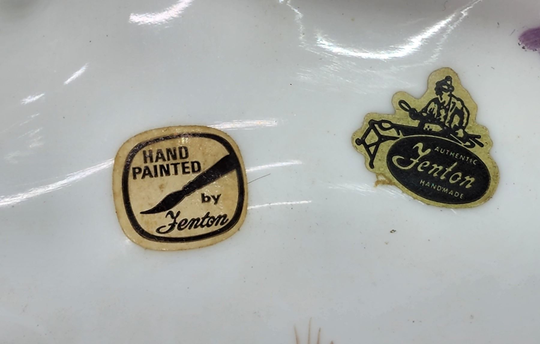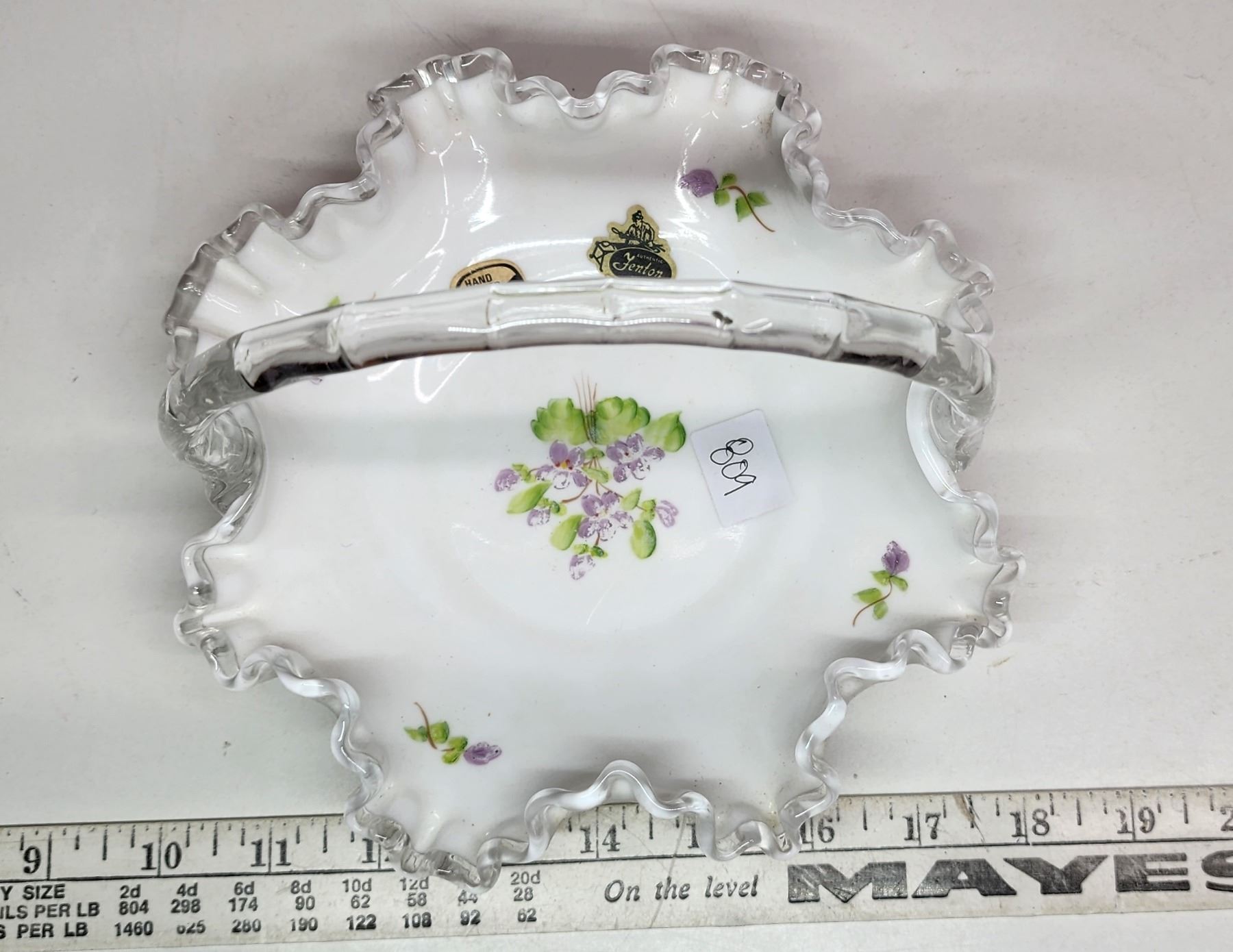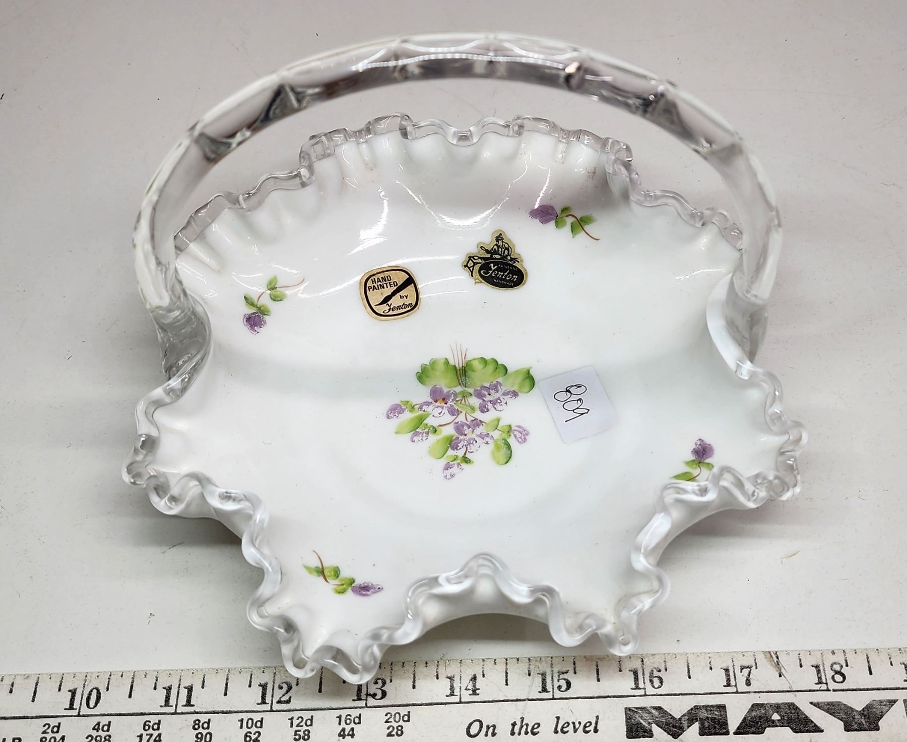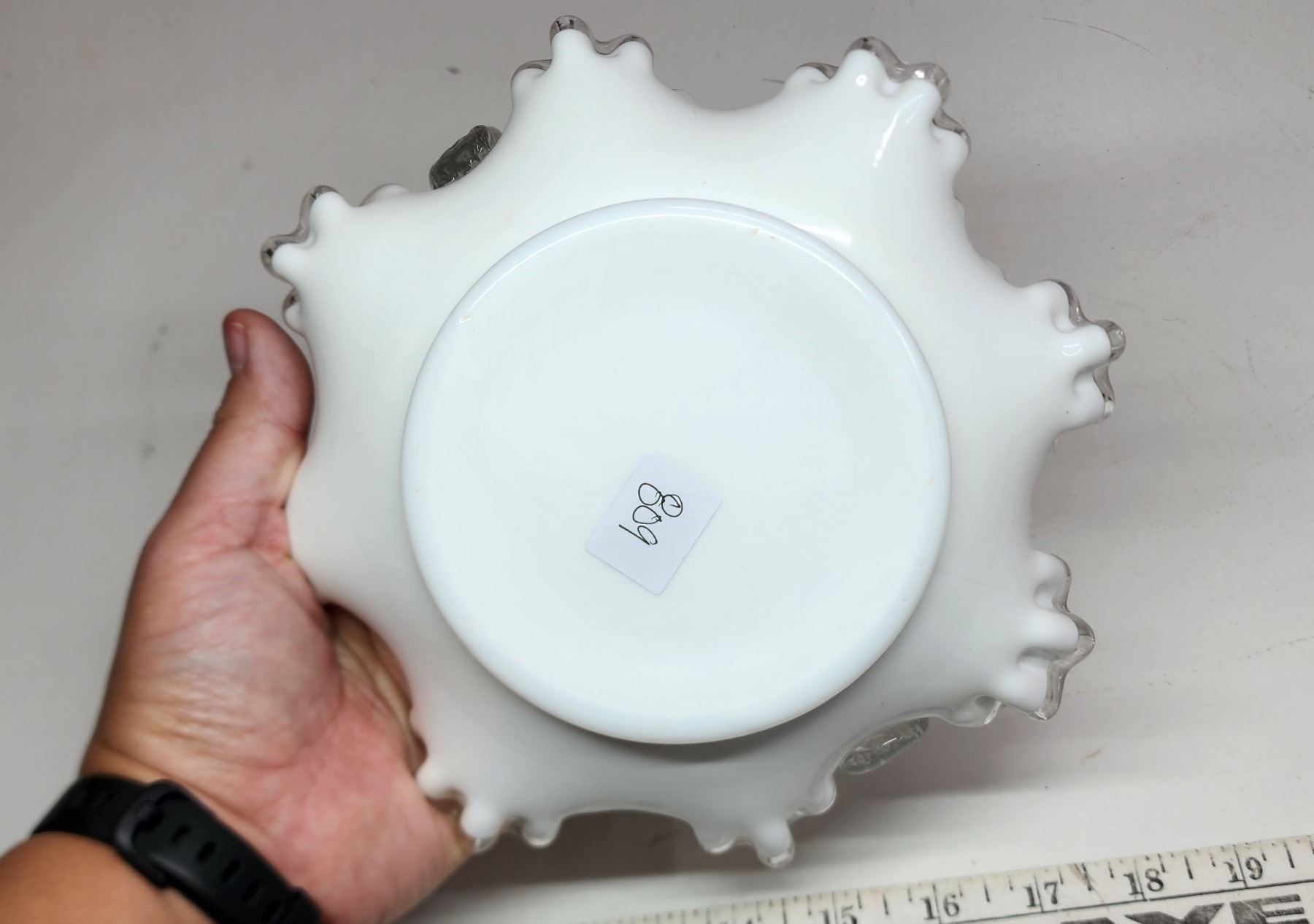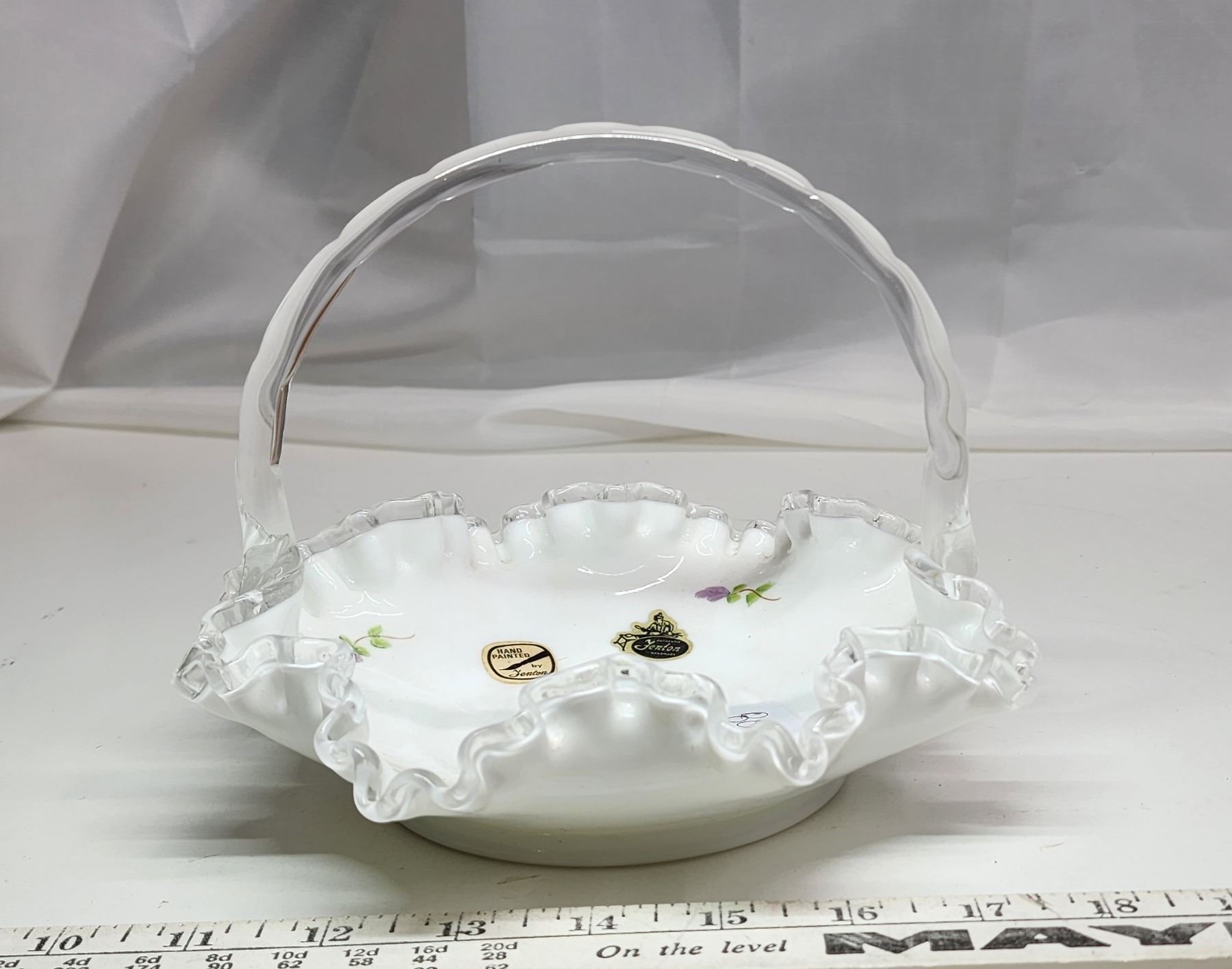 Fenton, ruffled edge bowl with handle - White & clear with original stickers