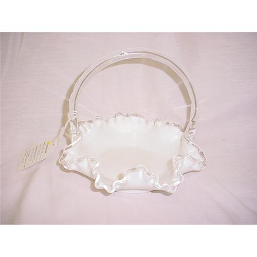 This is a nice looking Fenton silver crest basket with a glass applied handle. It stands 7 inches tall. No chips or scratches; in perfect condition! Fenton has been making collectible glass for years, located in Williamstown, W. VA. Silver crest is one of their best known lines and is sometimes called Petticoat Lace. Diameter of the base is 4 1/4 inches. There is no mark on the bottom so it must have been made before 1973 when Fenton began marking their items other than with paper labels.