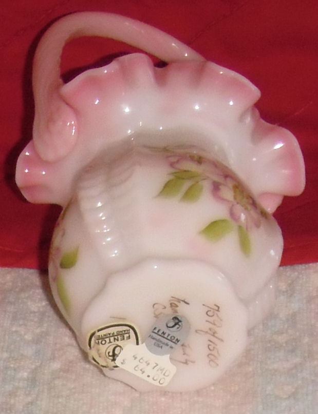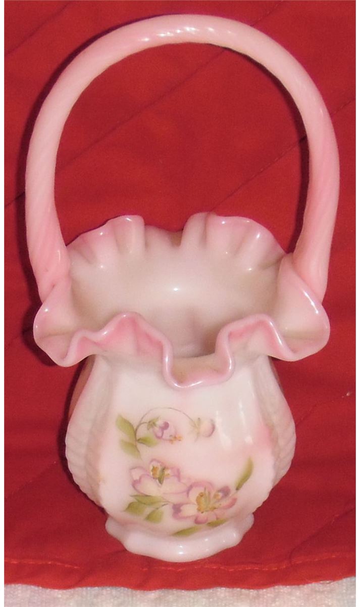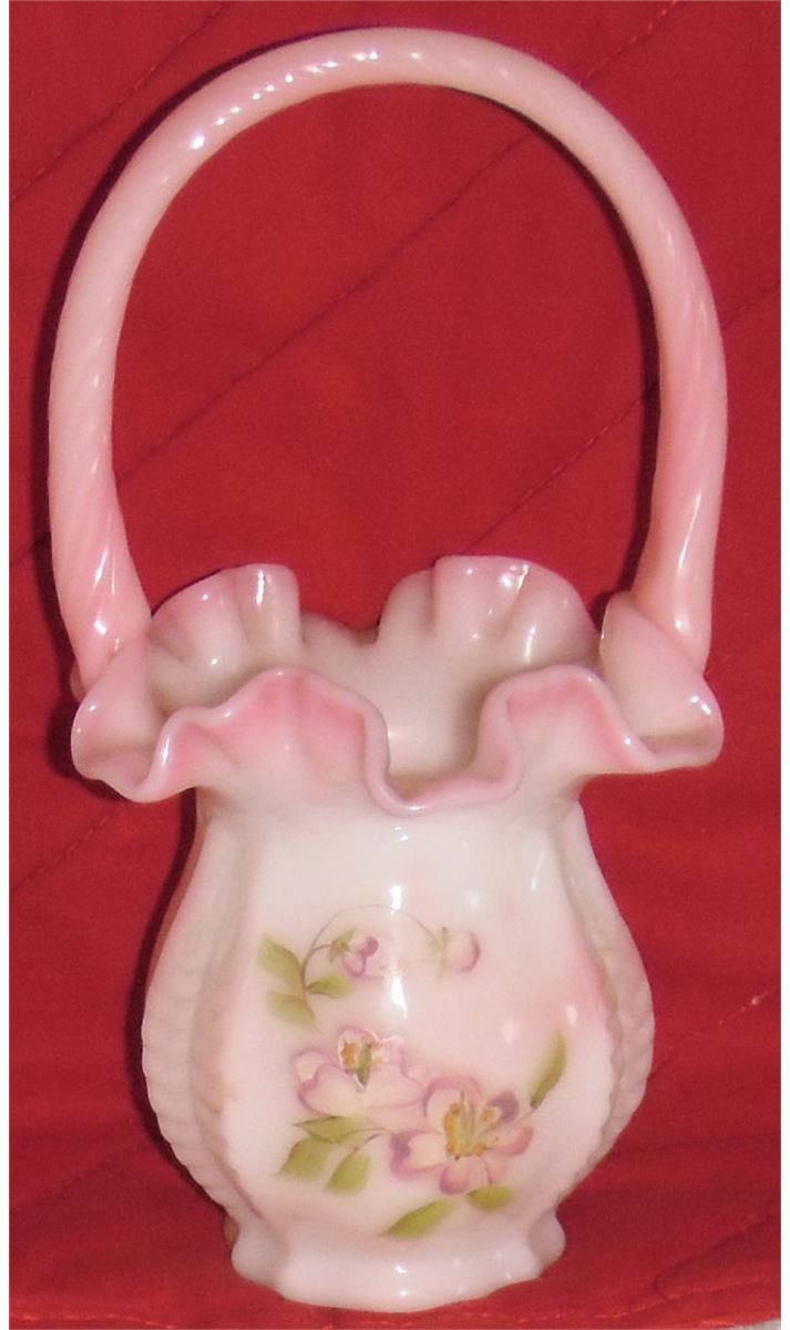 Collectible is this old (Mother now 90 years had it for many years) "Bride's Basket" as marvelous and proud creators 'Made in USA' Fenton small one about 8 high x 4 inches wide at the frilled pie-edge, exquisite with 3 cartouches of flowers hand painted a bit differently in each painting, with striking colour combination of milk white glass and pint accents, with the Artist's initials as signature under it as well as two logo stickers - this is a limited edition she did for only 1500, and is great for Mother's Day (or for grand-maman or any other special person) or give for nay other occasion or add to your collection now - and, oh men collect Fenton too !