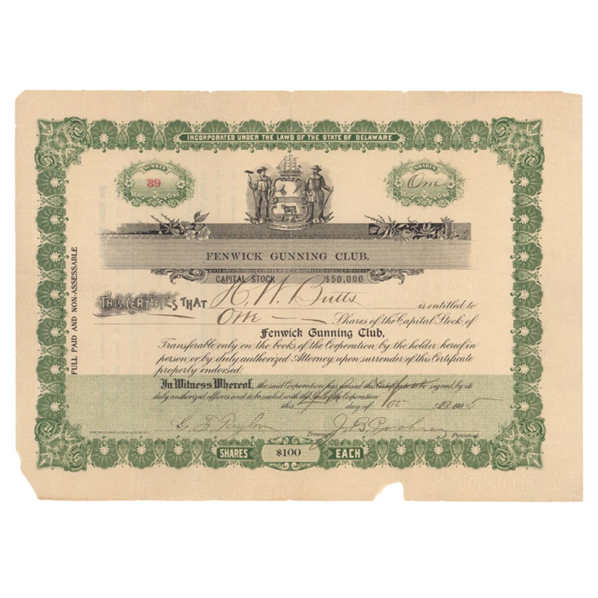 1905, Delaware. Stock certificate for one share. Green/Black. Vignette of the Delaware state seal at top center. Ornate green border. Paper loss at lower right-center, not affecting border or text. Also paper loss at lower left corner. Folds reinforced. Some edge wear. Overall Very Good.