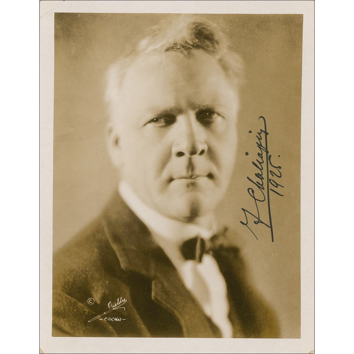 Renowned Russian opera singer (1873–1938) regarded as the foremost bass of his era. Dramatic vintage pearl-finish 7 x 9 head-and-shoulders photo, signed vertically in fountain pen, “F. Chaliapin, 1925.” A few surface creases, one affecting the facial area and another passing through half of the signature, a small area of surface loss at the bottom left corner, a tear to the top left corner, otherwise fine condition.