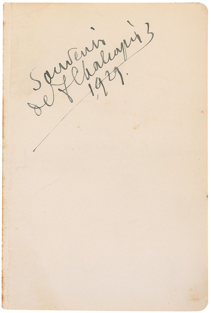 Fountain pen signature, “Souvenir de F Chaliapin 1929,” on an off-white 4.5 x 6.75 album page. In fine condition, with some scattered light toning, mainly to the edges.