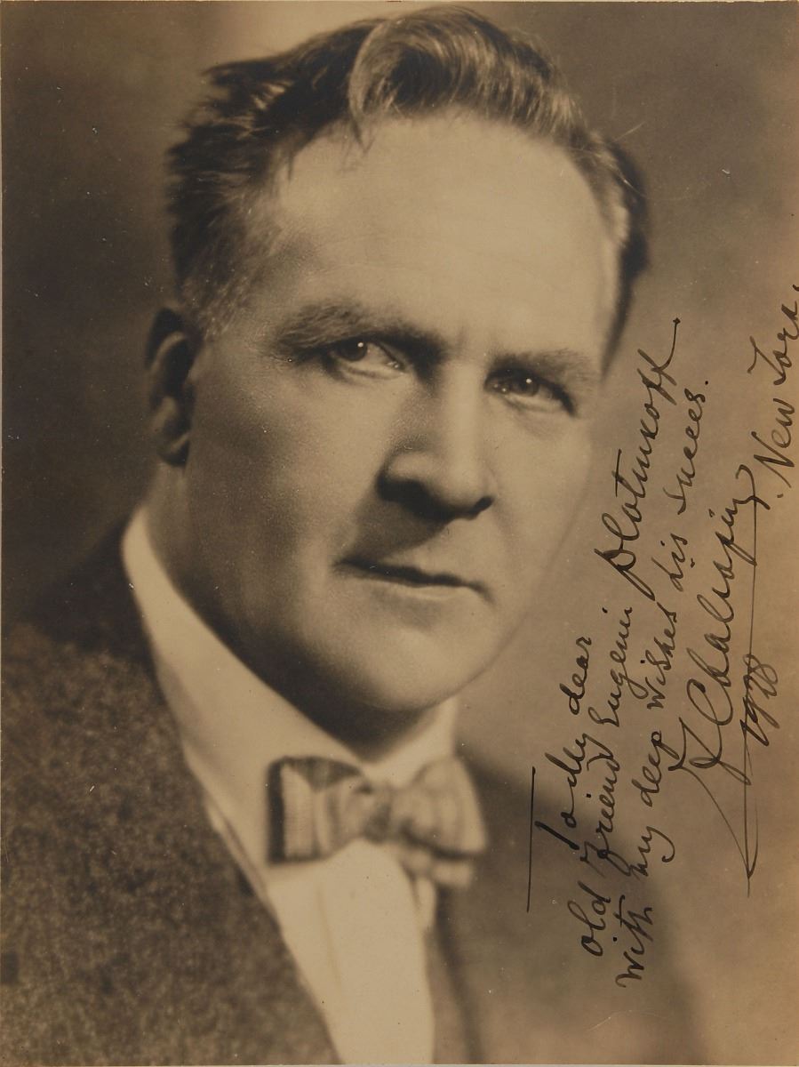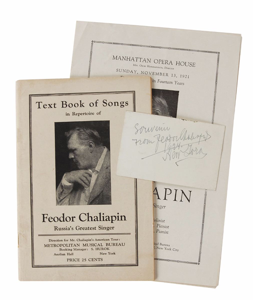 Two items: a striking matte-finish 6.5 x 8.5 formal portrait, signed and inscribed in fountain pen, “To my dear old friend Eugene Plotnikoff, with my deep wishes [for] his success, F. Chaliapin, 1928, New York”; and a fountain pen signature on a white 3.5 x 2.25 card. In fine condition. Accompanied by a program and a booklet about Chaliapin.