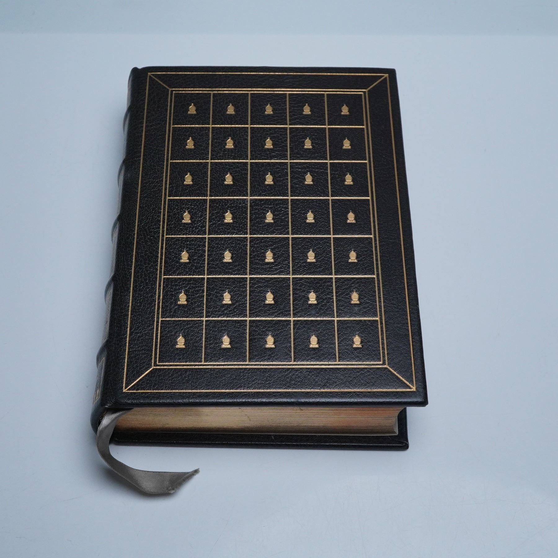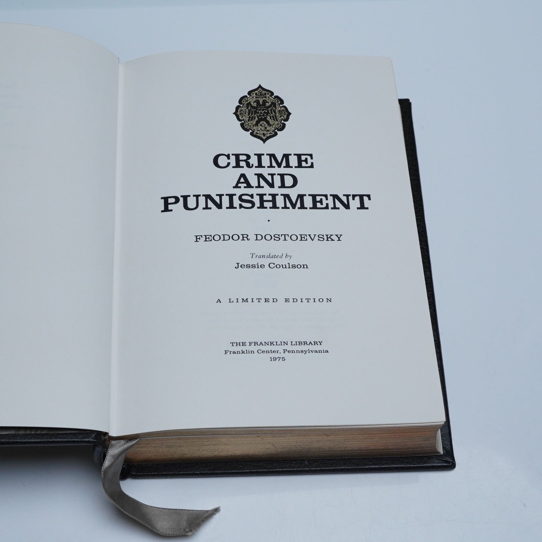 Franklin Library limited edition of Crime and Punishment by Feodor Dostoevsky, translated by Jessie Coulson and published in 1975 at Franklin Center, Pennsylvania. Bound in black leather with a gilt chessboard-style grid of bust emblems on the front and back and matching spine designs, this collector's volume features hubbed spine bands, moire endpapers, a silver satin ribbon bookmark, and gilt page edges. Printed on archival-quality paper as part of the Franklin Library series for collectors. Measures 6.5"L x 8.75"H. 552 pages.