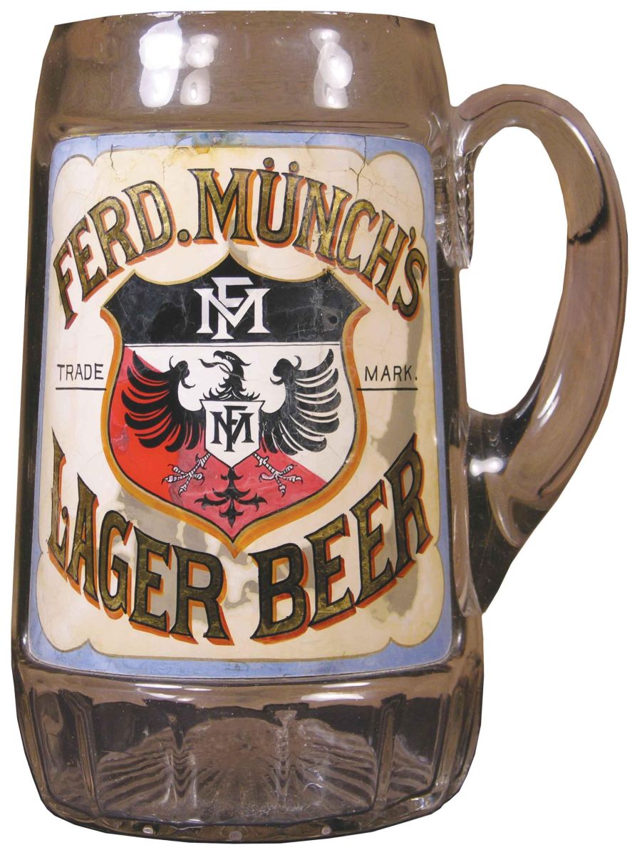 Ferd. Munch's Lager Beer, label under glass display mug. Some minor paint lifting and a one inch crack at 11:00 to the label, a few tiny chips on rim of mug otherwise very good condition. 10 inches tall X 8 inches wide with handle.