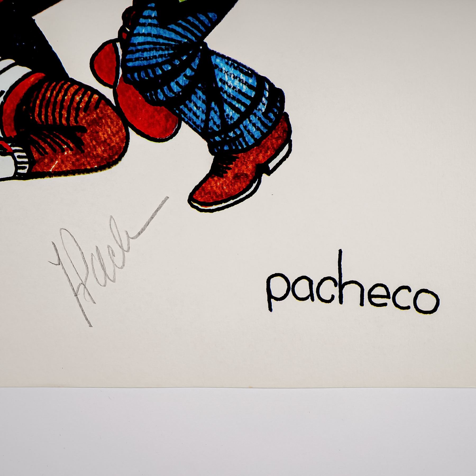 This vibrant and dynamic print, titled "Foul!", is by renowned boxing commentator, physician, and artist Ferdie Pacheco, famously known as the "Fight Doctor." Known for his distinctive, bold, and cartoon-like style, Pacheco captured the high drama and energy of the boxing world, a realm he knew intimately through his long association with Muhammad Ali. Rendered in striking black, red, green, and blue ink tones, the piece portrays a heated boxing moment: a fighter down on one knee, supported by his trainer, who points emphatically while shouting "Foul!" in bold red script above. The print exemplifies Pacheco's characteristic humor and storytelling, merging art with the intense emotion of the sport. This print is hand-signed by the artist in pencil in the lower right margin and numbered 395/500 in the lower left.