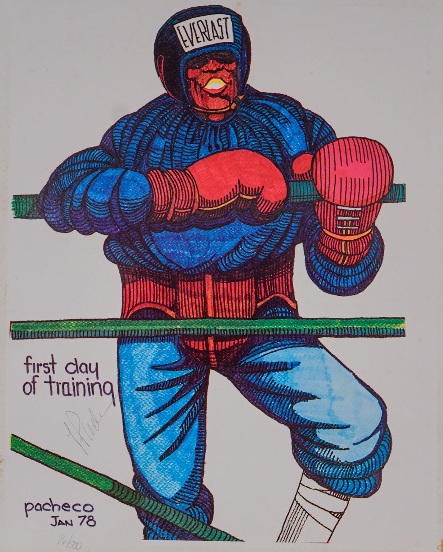 Vibrant limited edition lithograph by Ferdie Pacheco titled First Day of Training, dated January 1978. The piece depicts a boxer in colorful gear leaning against the ropes, rendered in Pacheco's signature bold and expressive style. Ferdie Pacheco, also known as the Fight Doctor, was Muhammad Ali's personal physician and cornerman, as well as a noted artist whose works celebrated the spirit and culture of boxing. Numbered 16/500 and hand-signed by the artist in pencil. Accompanied by the original Certificate of Authenticity and Certificate of Appraisal.