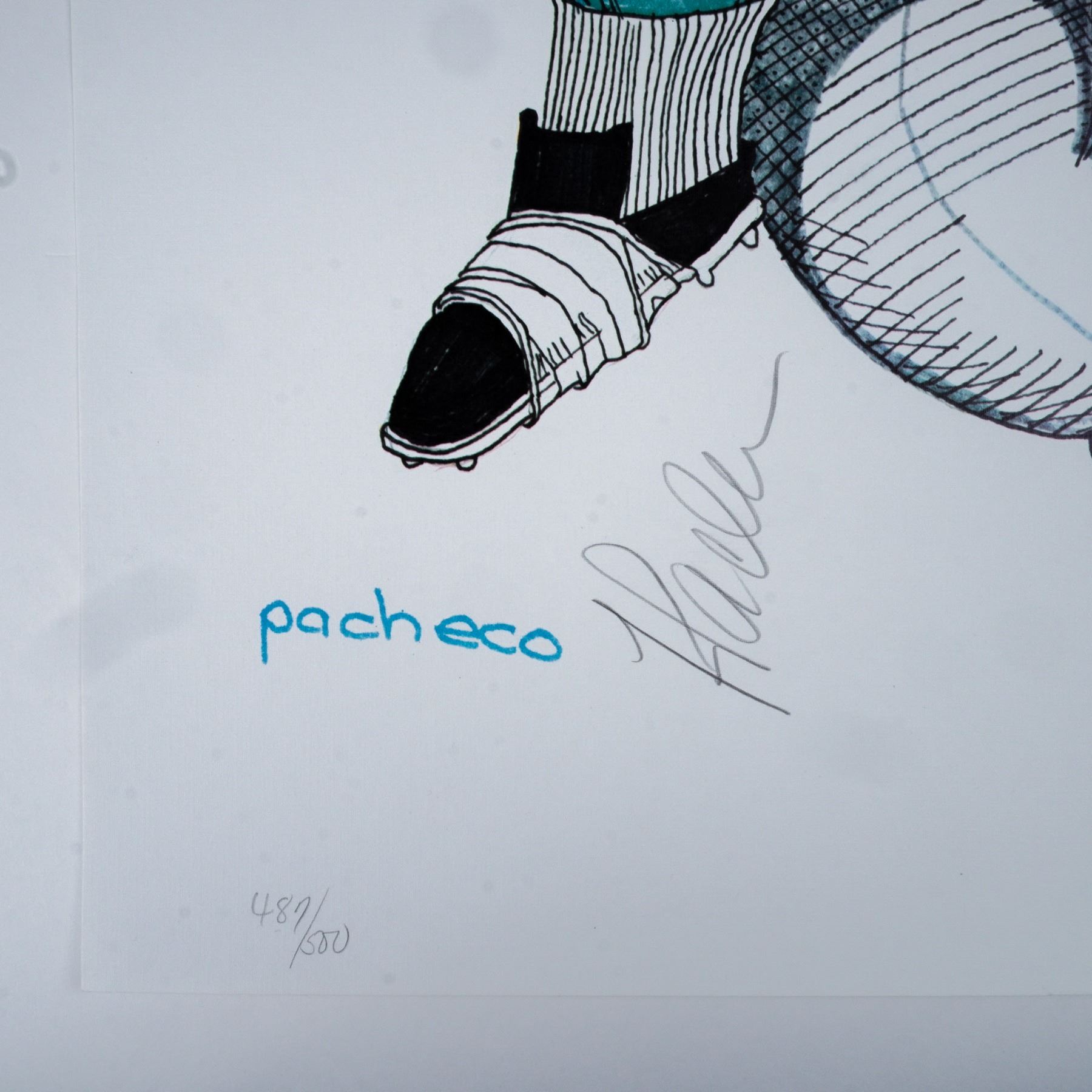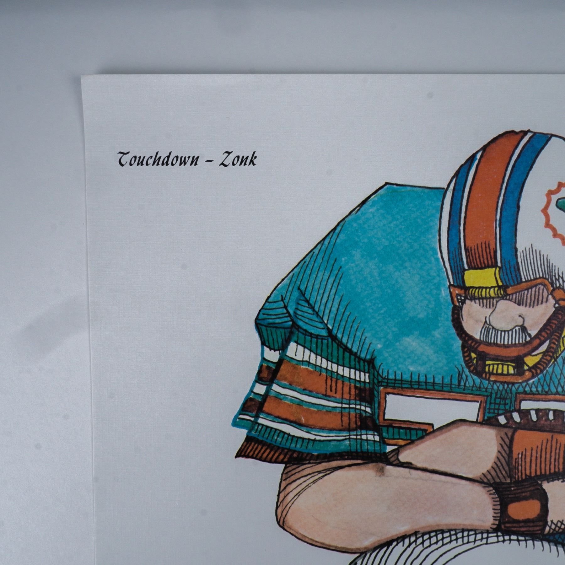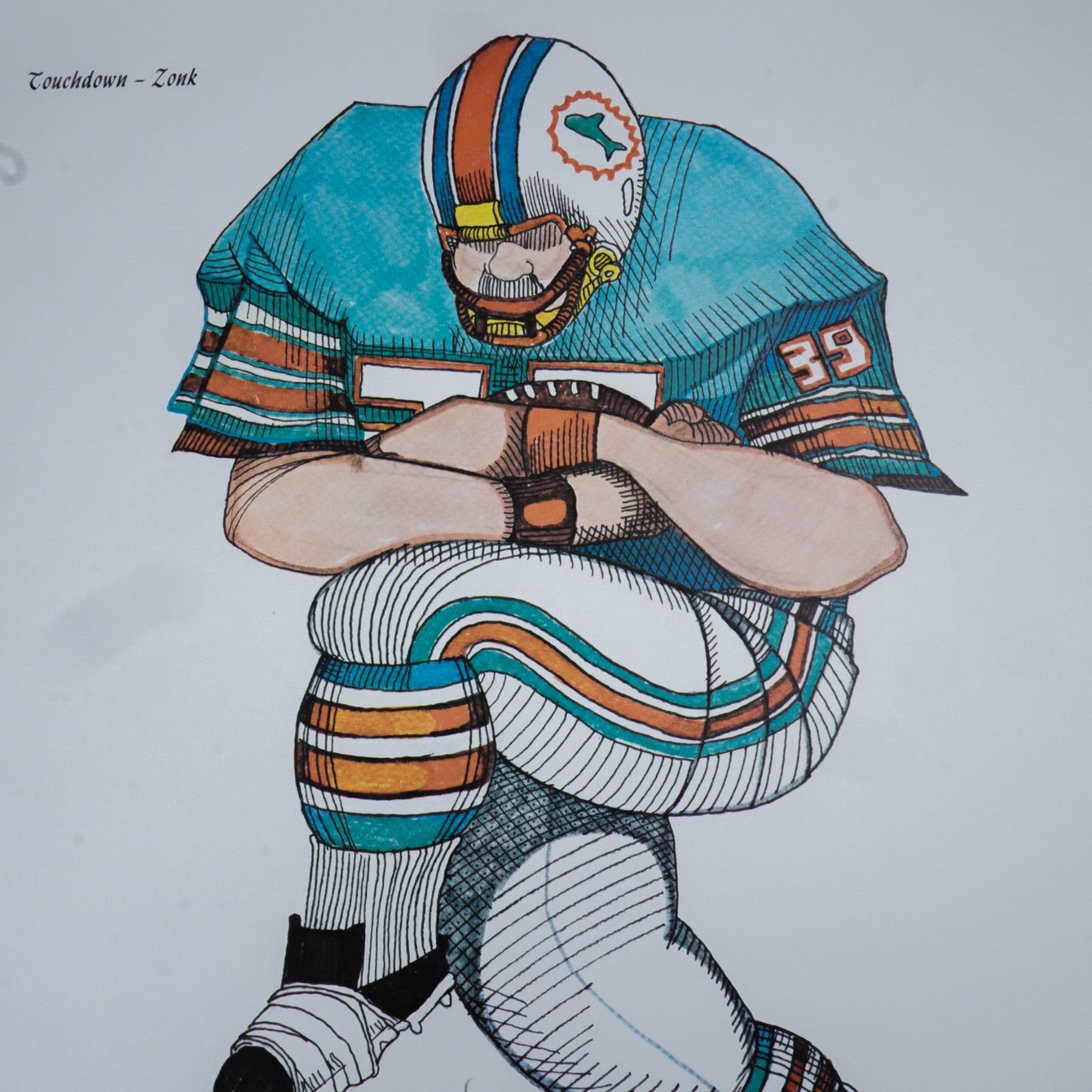 A dynamic limited edition print by Ferdie Pacheco (1927"2017), also known as The Fight Doctor, who was renowned for his boxing illustrations and work as Muhammad Ali's physician and cornerman. Titled Touchdown " Zonk, this piece pays tribute to legendary Miami Dolphins fullback Larry Csonka (#39), known for his powerful rushing style. The vibrant ink and watercolor illustration captures Csonka in his signature touchdown pose. Signed by the artist and numbered 489/500, this print measures 16.75"L x 21"H. A must-have collectible for Miami Dolphins fans and sports memorabilia collectors.