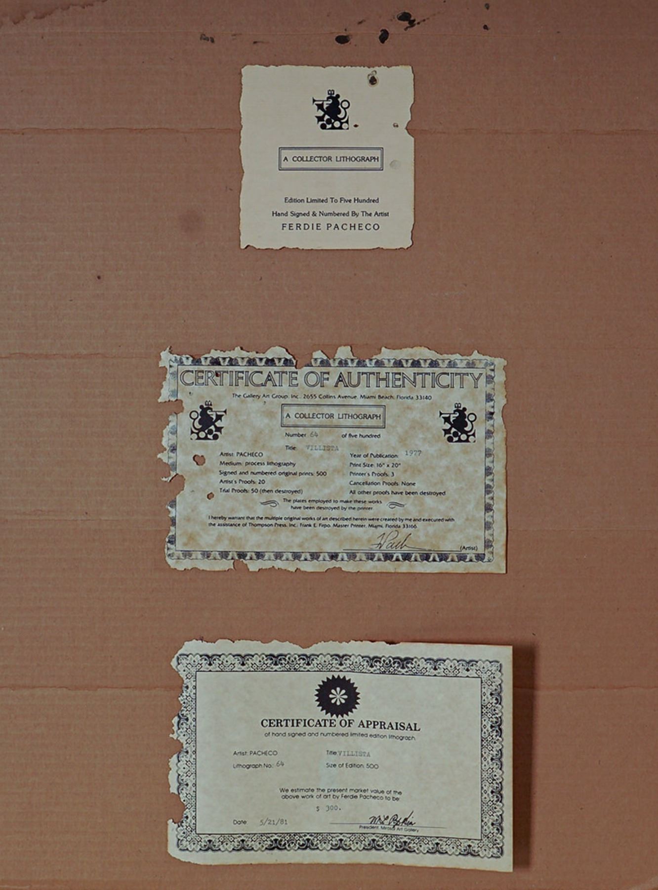 Limited edition hand-signed lithograph by Ferdie Pacheco titled Villista, numbered 64/500. The artwork depicts a vividly stylized revolutionary figure holding a rifle, a bottle, and a cigarette, rendered in Pacheco's signature illustrative style with bold color contrasts and fine linework. Pacheco, widely recognized as both a physician and artist, often infused his works with cultural and historical motifs reflecting Latin American heritage and humor. The piece is signed by the artist in pencil and includes original Certificates of Authenticity and Appraisal dated 1979 and 1981. A lively and collectible example of Ferdie Pacheco's vibrant print work, blending caricature with social commentary.
