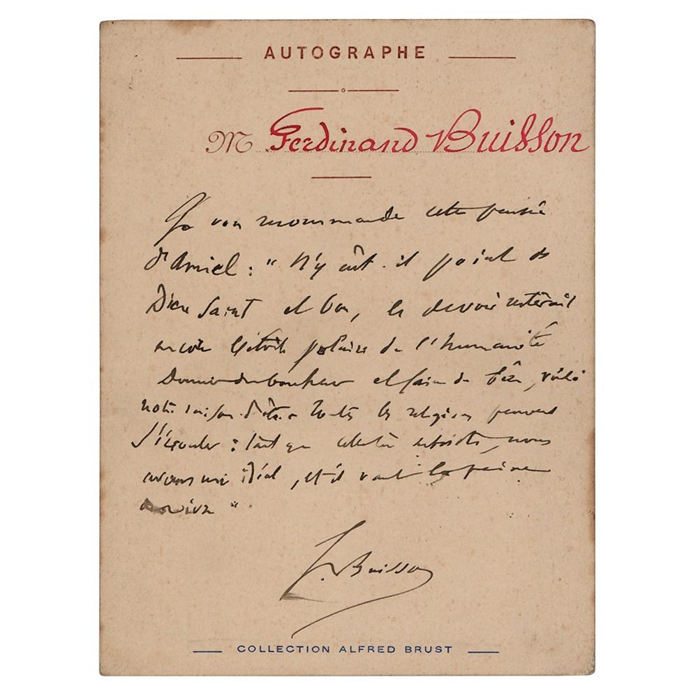 French academic and liberal politician (1841–1932) who helped build the modern French education system, and shared the 1927 Nobel Peace Prize with Ludwig Quidde. Uncommon ANS in French, signed “F. Buisson,” one page on a 4 x 5.5 stationery sheet imprinted with "Autographe, Collection Alfred Brust," no date. Handwritten note by the pioneering and influential educator, in full (translated): "I recommend to you this thought of Amiel: "Were there no holy and good God, duty would still remain the pole star of humanity. To give happiness and to do good, that is our reason. For all religions can collapse: as long as this one remains, we have an ideal, and it is worth living for.'" In fine condition.
