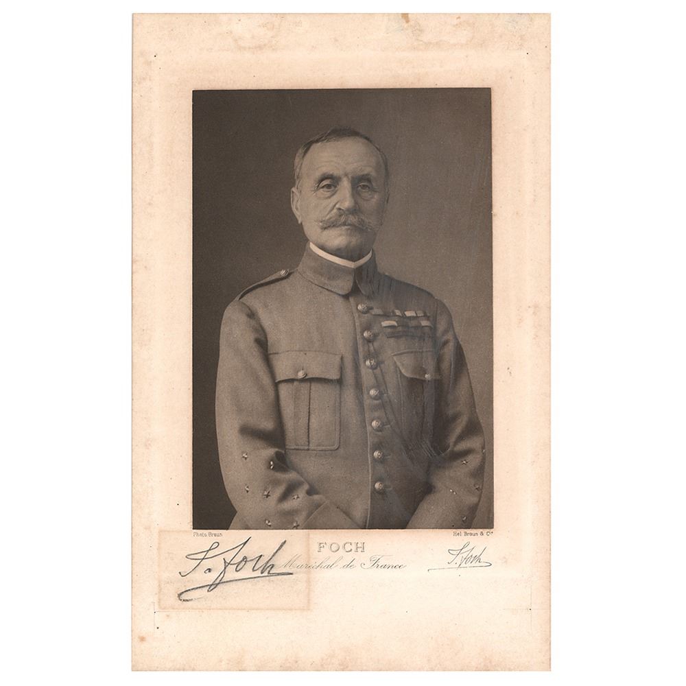 Highly detailed 6 x 9.5 lithograph print of Marshal Foch in uniform by Braun & Cie., signed in the lower border in pencil, "Foch." In very good to fine condition, with light soiling, surface loss to the top edge, and toning around the signature from prior matting.