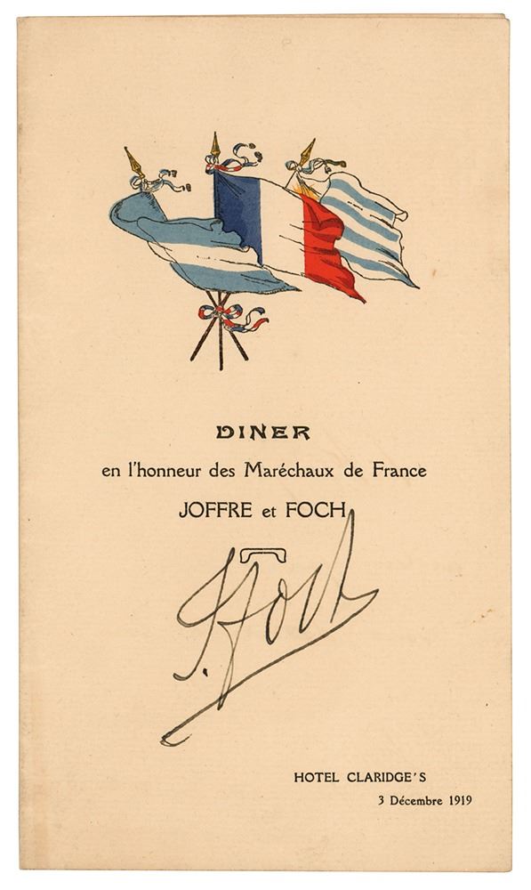 Vintage French-language menu for a "Dinner in honor of the Marshals of France, Joffre and Foch," held at Hotel Calridge’s on December 3, 1919, 3.75 x 6.5, signed on the front in fountain pen, "F. Foch." In fine condition.