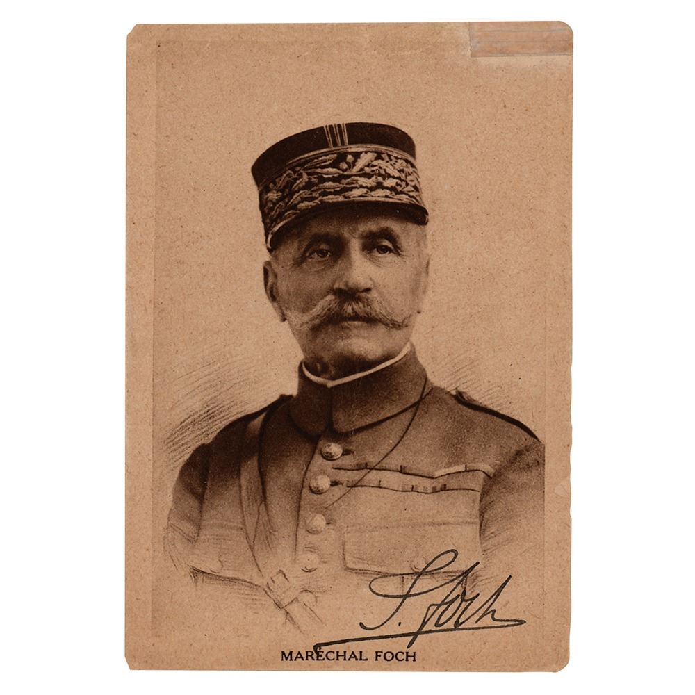 Vintage 3.75 x 5.5 postcard portrait of Marshal Foch in uniform, boldly signed in fountain pen, "F. Foch." In very good to fine condition, with a small area of repaired loss to upper right corner.