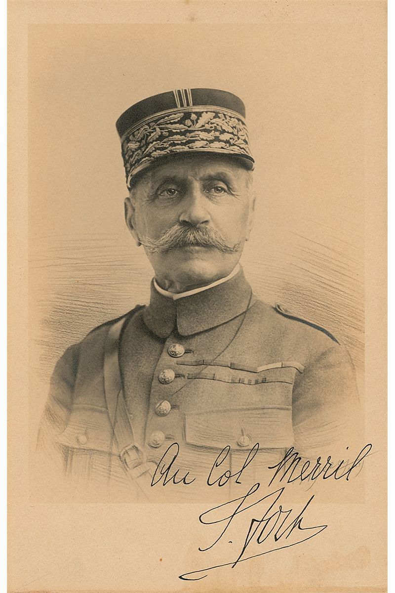 Vintage light-stock matte-finish 4.5 x 7 portrait of Foch in uniform, signed and inscribed in black ink, “Au Col. Merril, F. Foch.” In fine condition, with some subtle staining to lower border.
