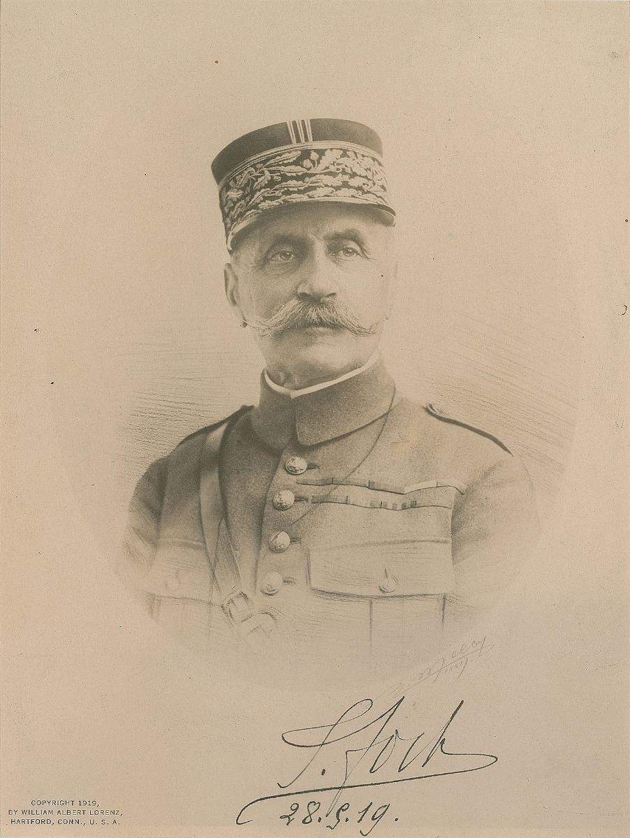 French military officer (1851–1929) who served as Supreme Commander of the Allied Armies in the final months of World War I. Vintage matte-finish 5.5 x 7.5 head-and-shoulders portrait of Foch in uniform by William Albert Lorenz, signed in black ink, “F. Foch, 28. 5. 19.” In fine condition.
