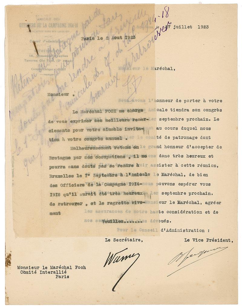 French military officer (1851–1929) who served as Supreme Commander of the Allied Armies in the final months of World War I. Two brief ALSs, both in French, both signed “F.F.” First is undated on a 4.5 x 7 sheet, and reads, in part: “Answer to Mr. Milleroy that I want to be with my family for the whole day of 2nd November”; the second is written on the upper portion of a typed letter to Foch, dated July 27, 1923, and reads, in part: “I could probably not go and see you in Bruxelles on 1st Sept[ember], for the annual meeting of officers of 1914-1918-war-campaigns.” In very good overall condition, with carbon stapled to front of second letter. RRAuction COA.