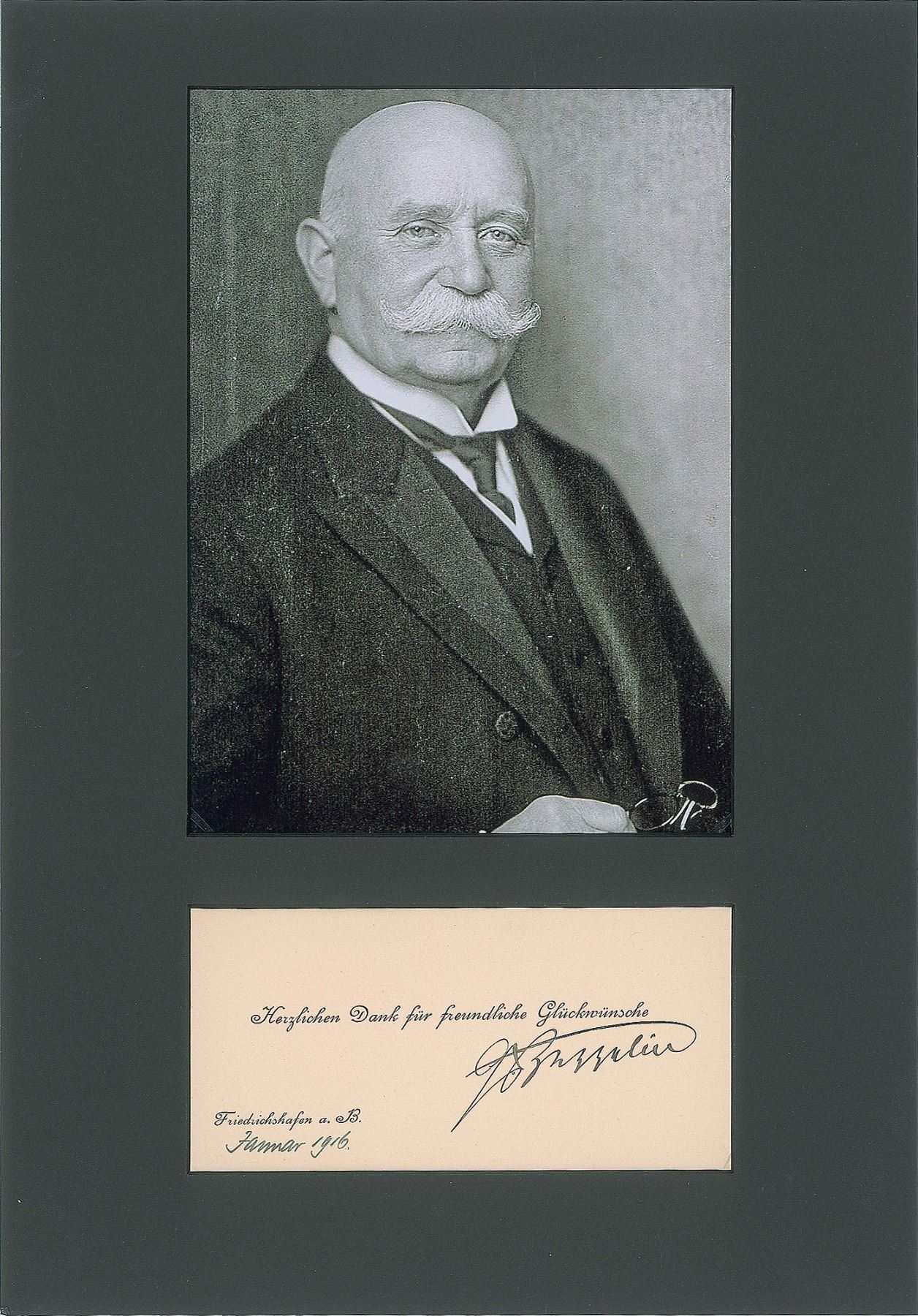 German engineer (1838-1917) who designed the famous rigid airship that bears his name. Fountain pen signature, "G. v. Zeppelin, Januar 1916,” on an off-white 5.5 x 2.75 compliments card. Matted with a modern glossy photo to an overall size of 8.25 x 11.75. In fine condition.