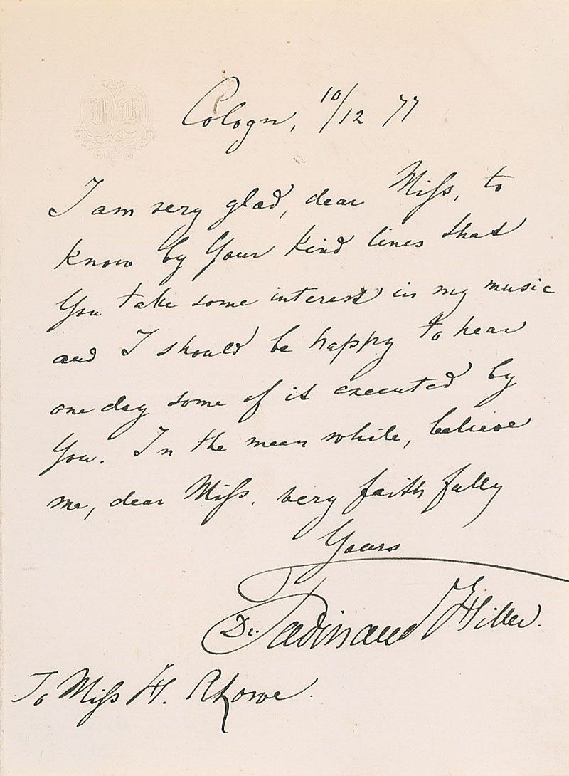 German composer, conductor, writer and music-director (1811–1885). ALS signed “Dr. Ferdinand Hiller,” one page, 4 x 5.25, embossed personal letterhead, December 10, 1877. Letter to an admirer. In part: “I am very glad, dear Miss, to know…that you take some interest in my music and I should be happy to hear one day some of it executed by you.” In fine condition. Accompanied by an original unsigned carte-de-visite.