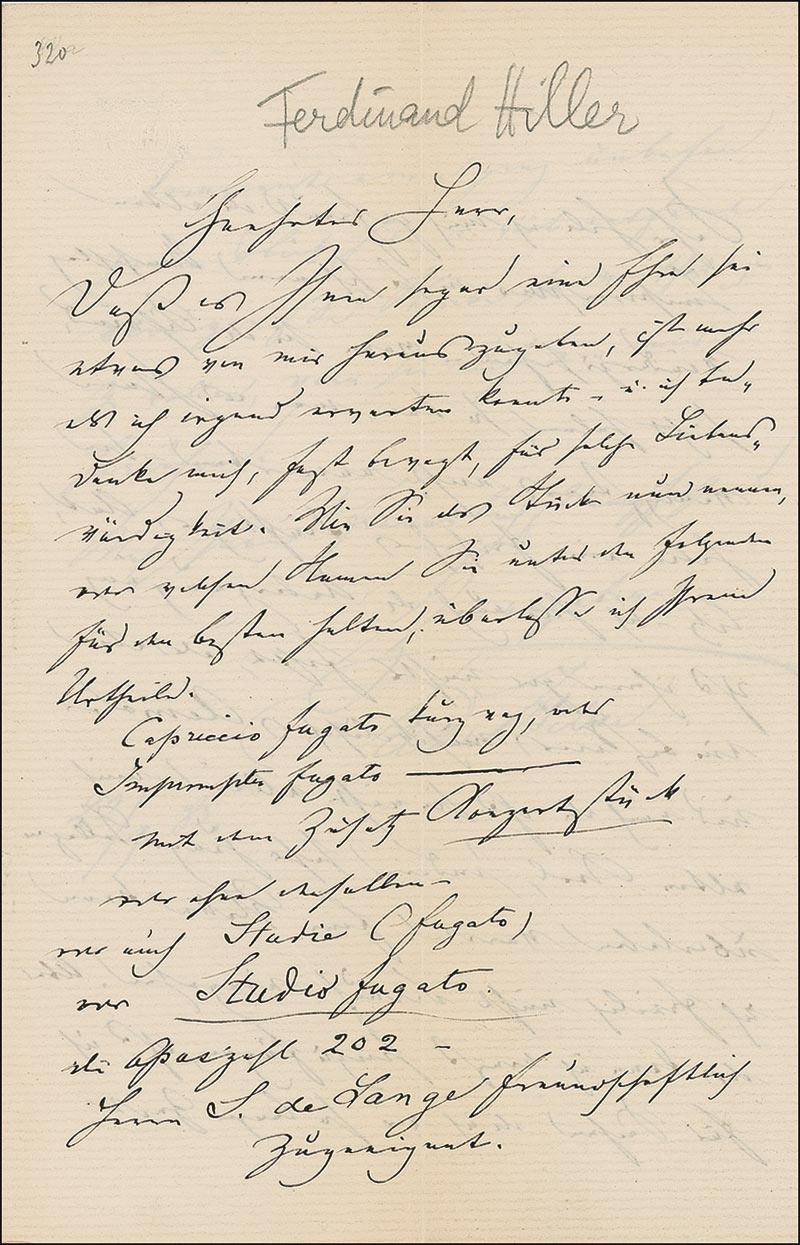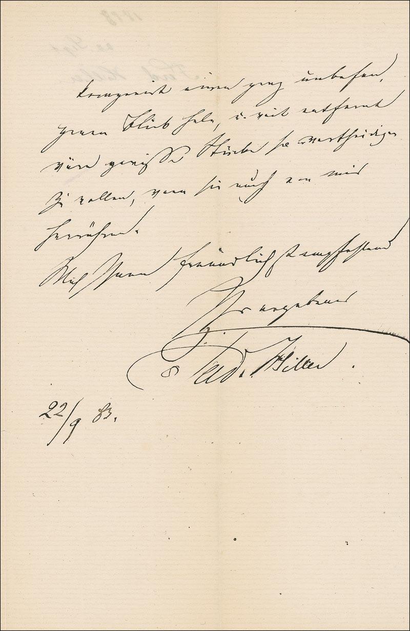 German composer, conductor, writer and music-director (1811-1885). ALS in German, signed “Ferd Hiller,” three pages on two adjoining sheets, 5.25 x 8.25, personal letterhead, September 22, 1883. Letter to his publisher. In part [translated]: “That you are even honoured to publish something for me is more than I could expect and I thank you for all this. How you name the piece or which name you find most suitable is up to you. Capriccio fugato with the addition concert piece.” In fine condition, with intersecting mailing folds, one through a single letter of signature, trivial edge toning, and pencil notation to top edge. RRAuction COA.