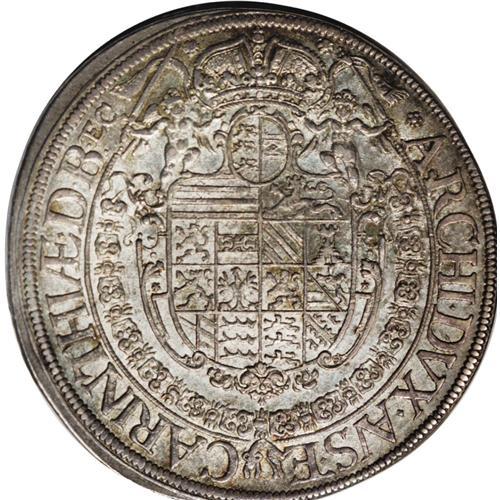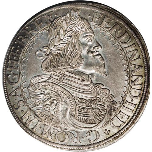 <B>Ferdinand III Taler 1654 Saint Veit, </B></I>KM924, Davenport 3194, lovely toned UNC, every tiny detail is boldly expressed and the surfaces exhibit a satiny gloss. A most attractive example! Struck from roller dies giving the planchet a slight wave.<BR><BR><b>Shipping:</b> Coin/Currency (<a target="_blank" href="http://www.heritageauctions.com/common/shipping.php">view shipping information</a>)