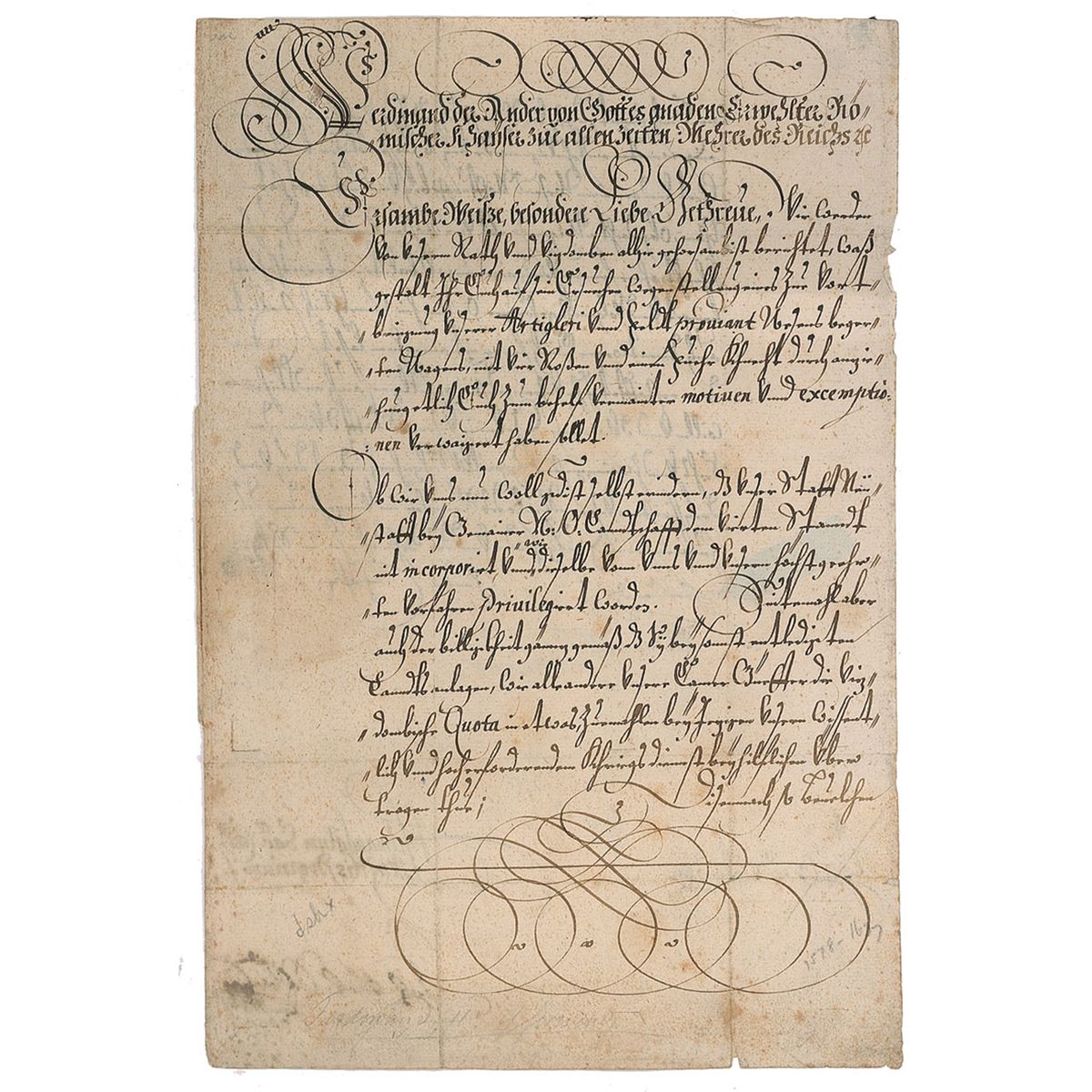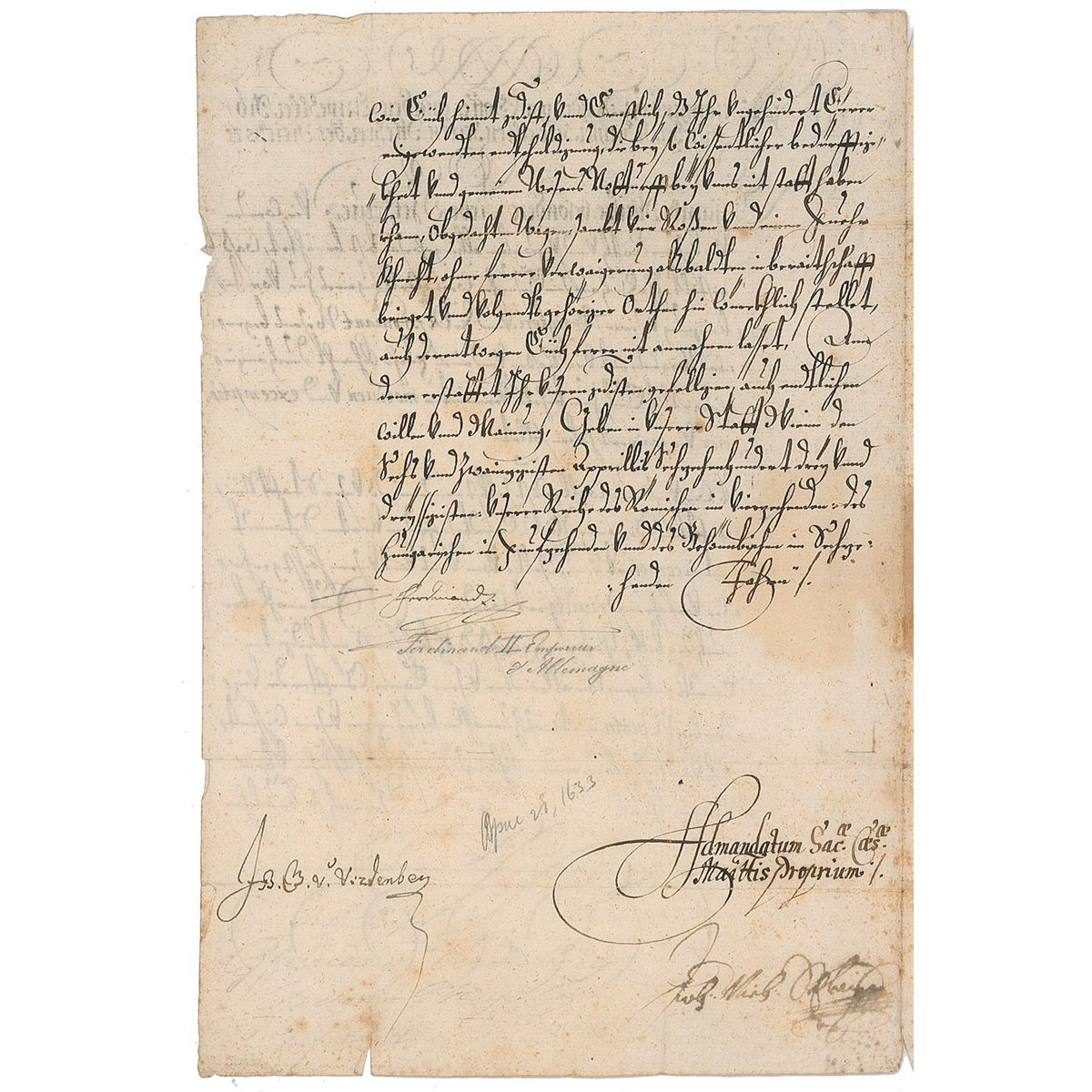 Holy Roman emperor, king of Bohemia and of Hungary (1578–1637); successor of Holy Roman Emperor Matthias. Manuscript DS, in German, signed “Ferdinand,” one page both sides, 8 x 12, April 26, 1633. Untranslated document, neatly signed at the conclusion. Pencil notations, including one under signature, scattered toning, intersecting folds, and scattered foxing, otherwise very good condition. The paper seal on the second integral page is crisp and intact.
