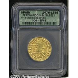 <B>Ferdinand & Isabel gold 2 Excelentes Seville, </B></I>ND, 1476-1516, Friedberg 129. XF45 ICG, a nicely struck coin with bold details. <BR><BR><B>Important notice:</B> Heritage usually auctions material at the rate of 200-250 lots per hour. On some occasions eBay Live bid software or the Internet may not be able to keep up with the pace of the auction. We recommend placing a realistic absentee bid now as insurance to avoid disappointment. Occasionally the auctioneer may eliminate or reject an eBay Live bid, and the auctioneer may also reopen a lot after the close of the eBay live bidding (usually because we missed an audience bid), and may reject your bid even if it shows you as the winning bidder. By bidding via eBay Live, you agree that Heritage may award the lot to another bidder at its sole discretion under the circumstances described above or any other reasonable circumstances. Since eBay bids are not shown to us until we open the lot on the floor, we treat those bids just like floor bids. In most cases the floor responds before the eBay bid is presented to us, due to Internet lag time, so for consistency we have made it a policy that floor bids are always considered first over tie eBay live bids. Also please note that all Heritage lots purchased through eBay Live carry a 20% Buyer's Premium. Please make sure you read the Terms and Conditions before you bid.