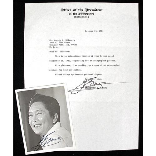 <Our item number 141132><B>Marcos, Ferdinand.</B> (1917-1989) President of the Philippines (1965-1986), 1 p., 8 1/2 x 11 in., typed Letter Signed as President on Office of the President letterhead, dated October 14, 1982. Reply to a request for an autographed picture. Accompanied by boldly Signed Photo, 4 x 5 in. and transmittal envelope. <BR>Estimated Value $150 - 200. <I><BR>Proceeds from the sale of this lot will go to the Manuscript Society Endowment Fund.</I> <BR><BR>Our item number 141132<BR><IMAGES><P ALIGN="CENTER"><IMG SRC="http://www.goldbergcoins.net/liveauction/49jpegs/141132.jpg"> </P></IMAGES>