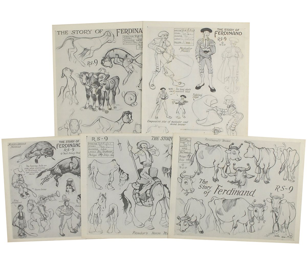 (Walt Disney Studios, 1938) Five original stat model sheets featuring the designs for characters from Ferdinand the Bull, including the tough calves, matadors, Picador’s horse, Ferdinand’s mama, and miscellaneous supporting figures. Sheets measure 10 x 12.5. In overall fine condition.