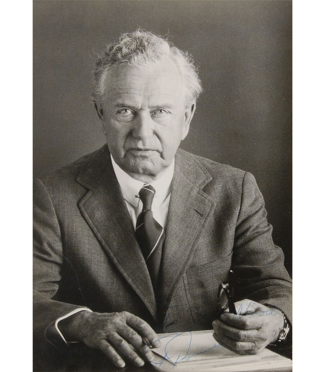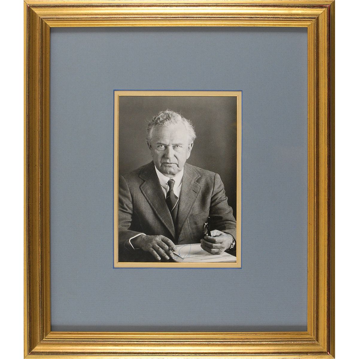 Technical automobile designer (1909–1998) and son of the founder of Porsche. Sharp glossy 4.5 x 6.5 photo of Porsche seated at his desk, signed and inscribed in blue ballpoint, “To Bill Wood, F. Porsche.” Double-matted and framed to an overall size of 12.5 x 14.5. In fine condition, with poor contrast to the inscription.