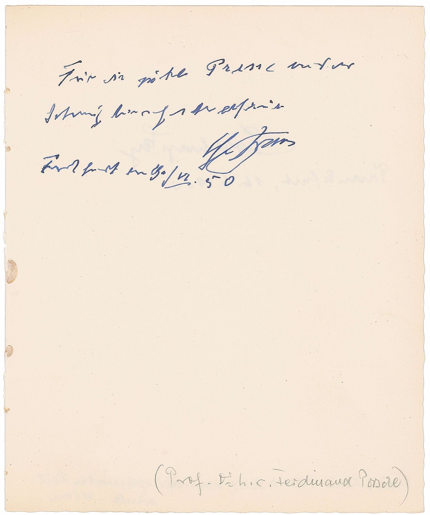 Auto engineer and inventor (1875–1951) who designed Volkswagen and Porsche automobiles. Fountain pen signature in German on a 6.75 x 7 off-white guest book page. Porsche writes that he is pleased by the "good publicity for our meeting," signing underneath, "F. Porsche, Frankfurt," with a date of June 9, 1950. A pencil identification has been added at the bottom of the page. In fine condition, with all writing a bit shaky. Page was taken from the guestbook of Alexandre Marius Dées de Sterio (1944–2006), a media scholar from Luxembourg, and is also signed on the reverse by the former director of the Spanish Riding School in Vienna, Alois Podhajsky. A scarce offering from the legendary auto pioneer.